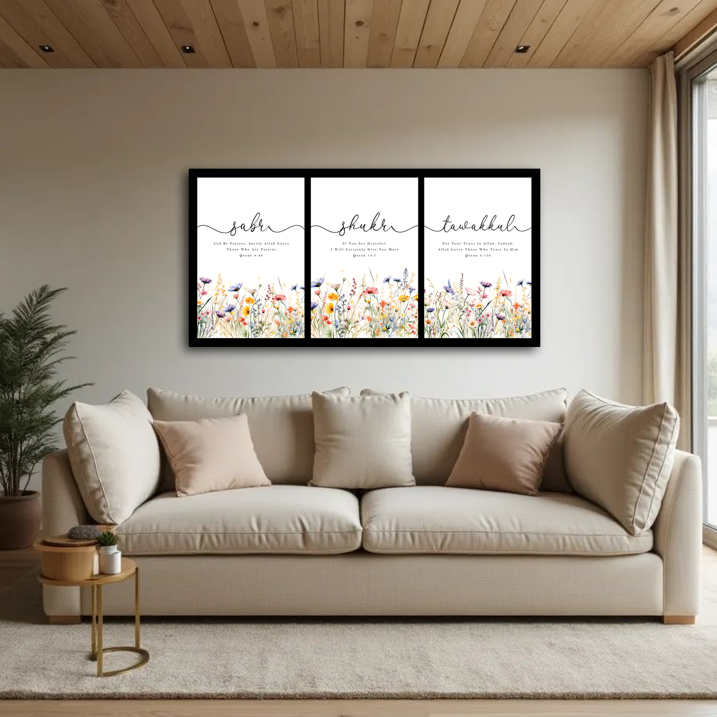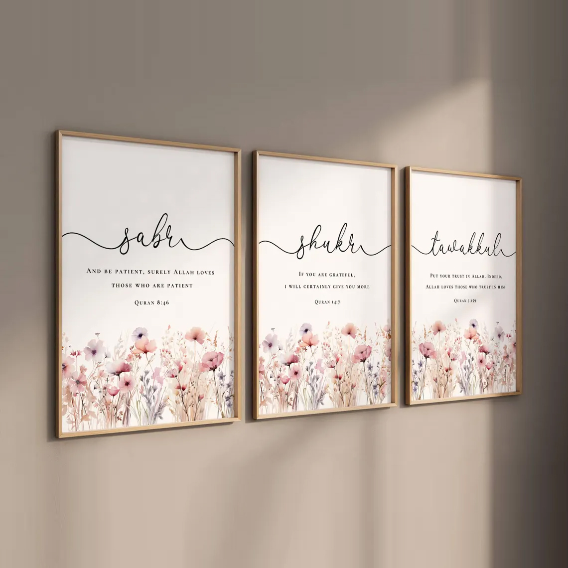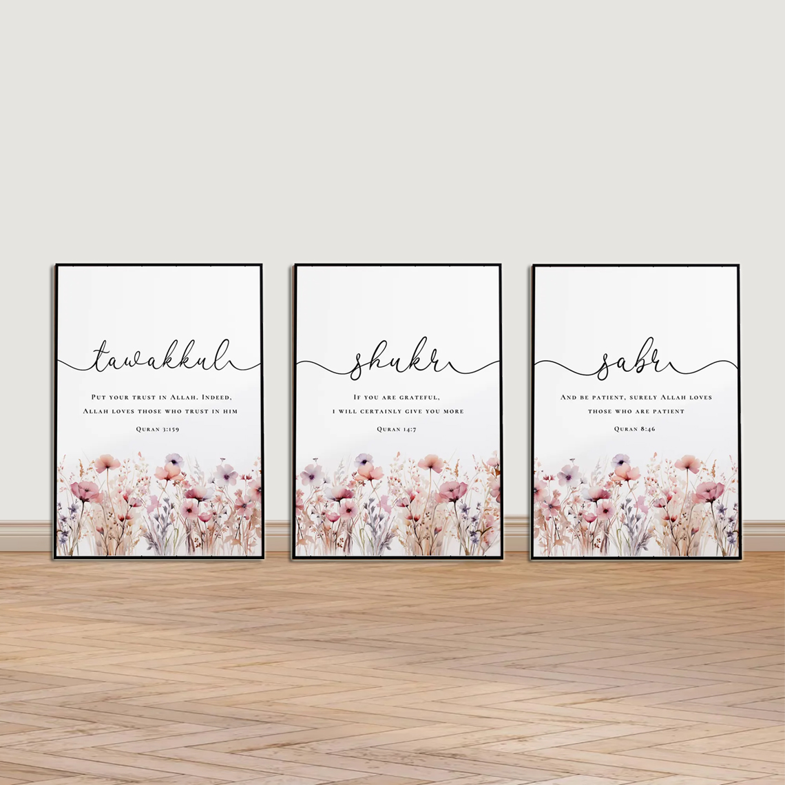 Sabr Shukr Tawakkul Floral Islamic Wall Art Set of 3 – Premium Framed Muslim Home Decor
