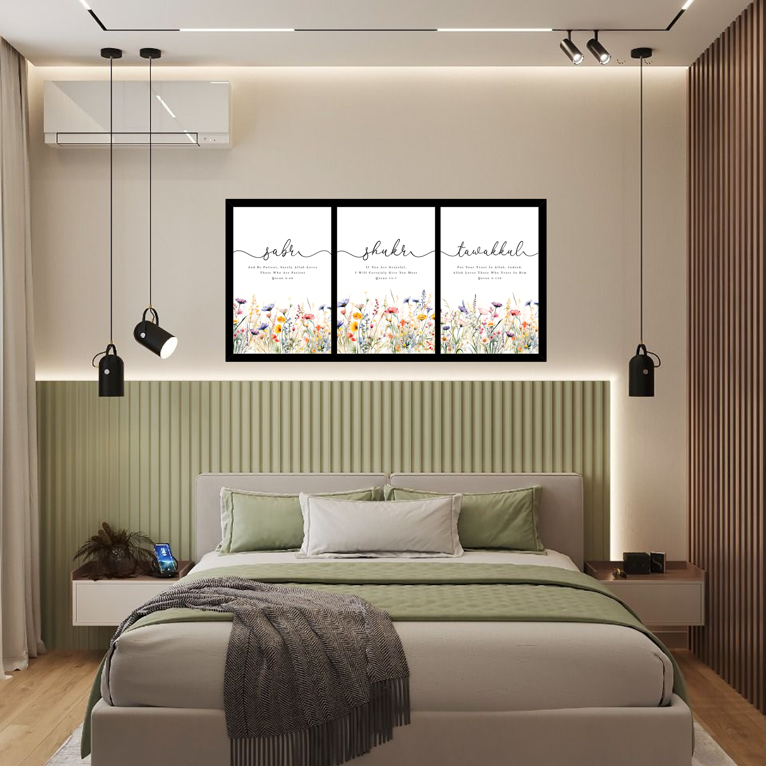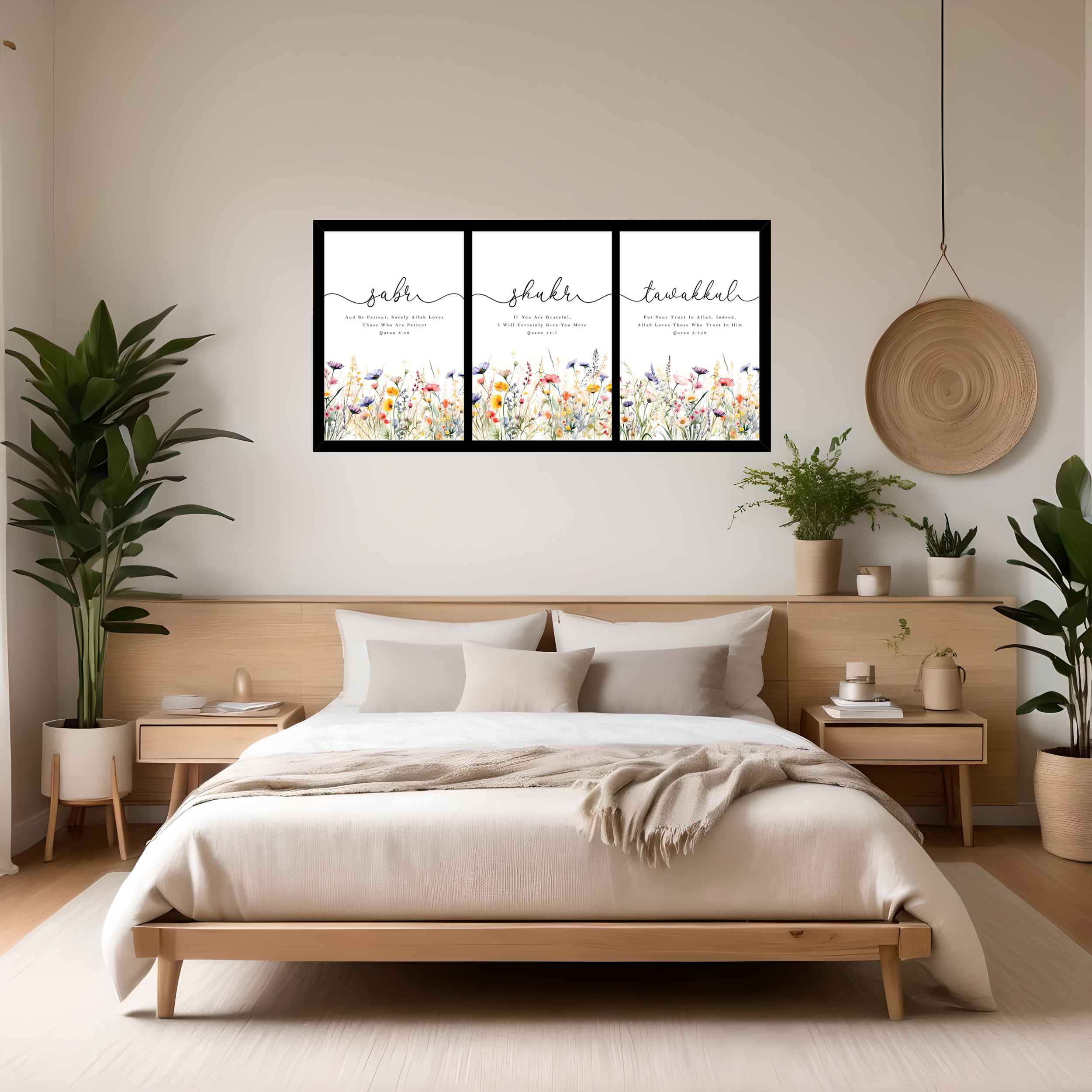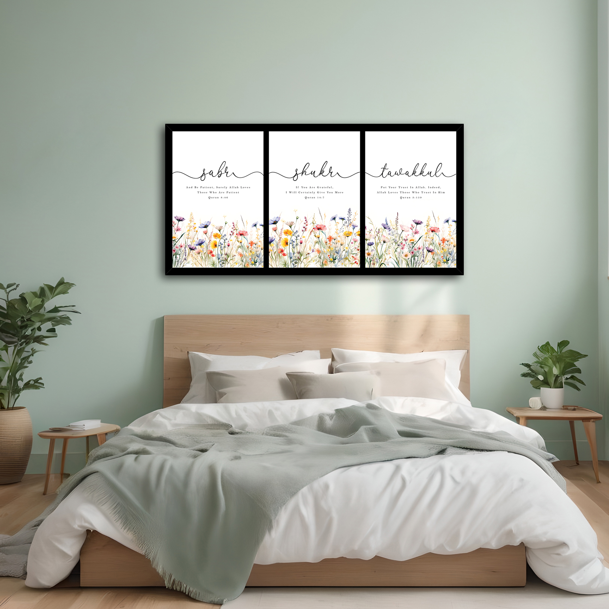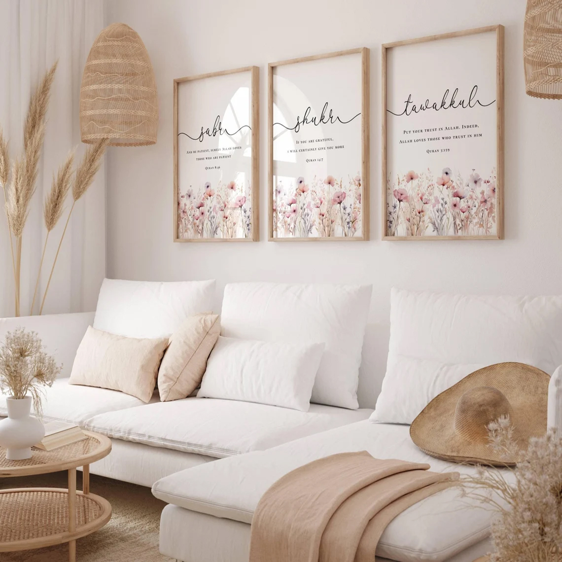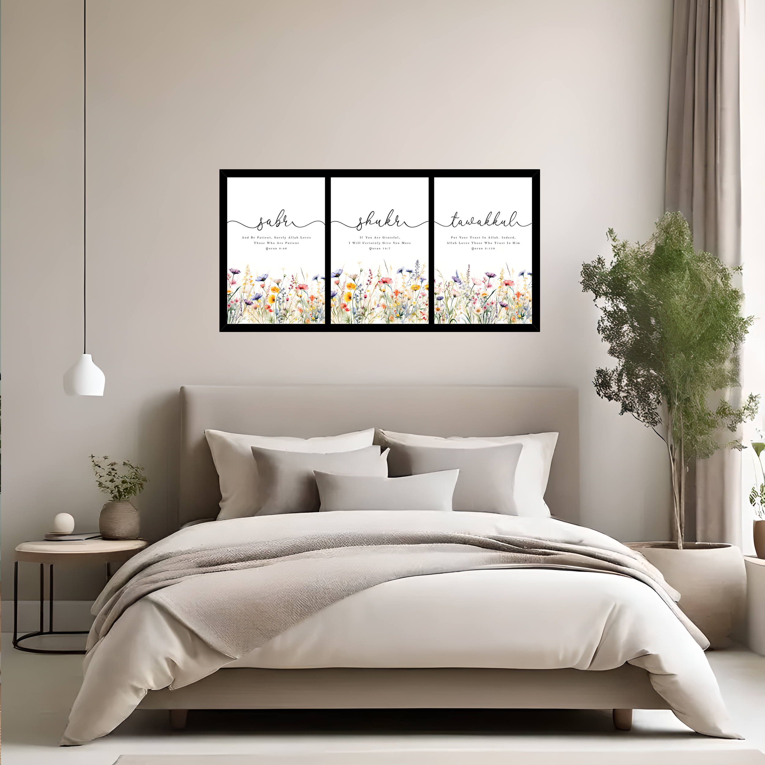 Each artwork represents a powerful Islamic principle. Sabr symbolizes patience, Shukr represents gratitude, and Tawakkul reflects complete trust in Allah. Together, they create a meaningful visual reminder for daily faith and positivity. The floral detailing adds a soft aesthetic touch, making this wall art ideal for modern, boho, Scandinavian, and luxury interior themes.