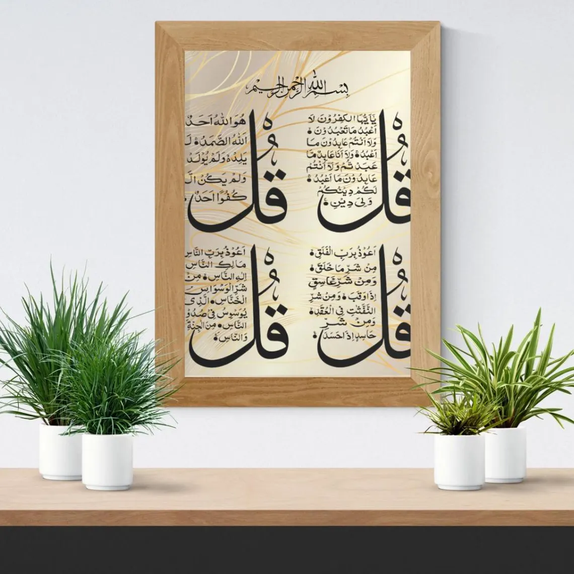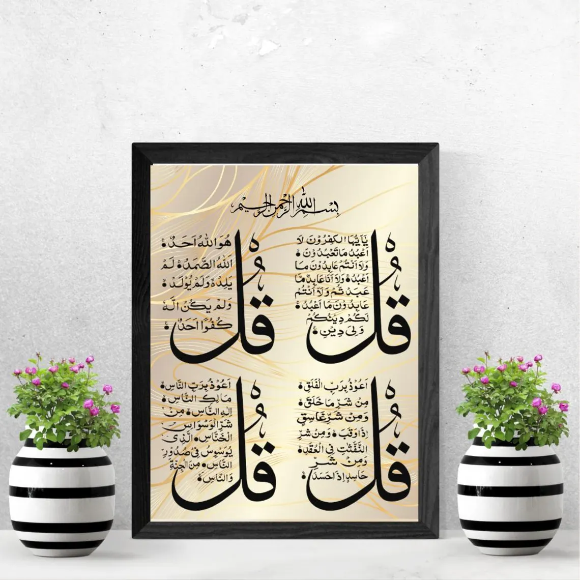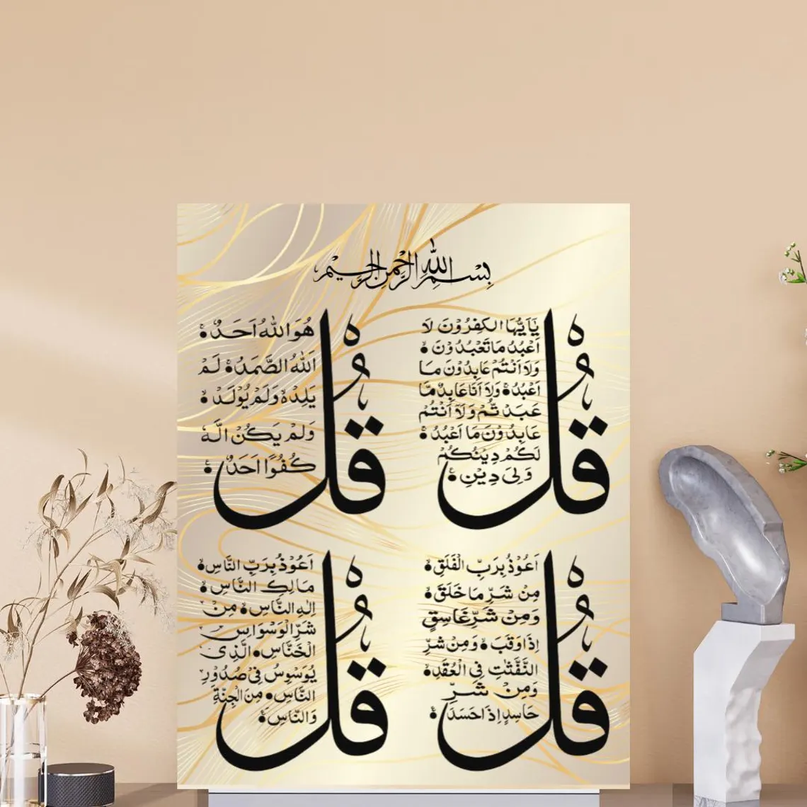 Striking Gold & Black Design The visual impact of this piece lies in its sophisticated color palette. The deep black calligraphy of the four surahs stands out vividly against a shimmering gold-toned background. To add a sense of movement and contemporary flair, the background is accented with elegant, flowing golden lines that weave between the sacred texts. This high-contrast design makes it a perfect focal point for a living room, entryway, or office, adding a touch of luxury and spiritual depth to your walls.