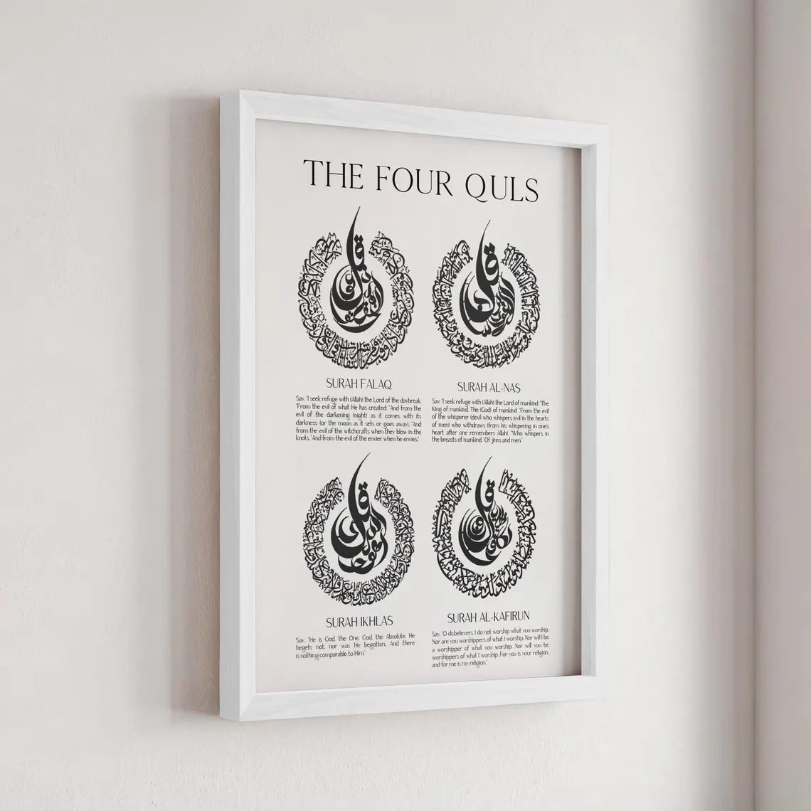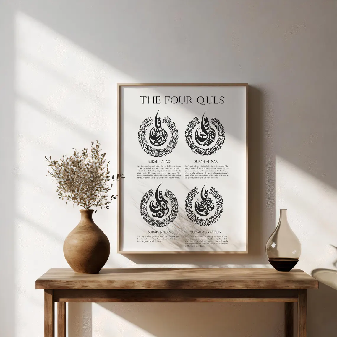 Surah Al-Falaq & Surah An-Nas: The "Mu'awwidhatayn," recited to seek refuge from the evil eye, envy, and all forms of harm. By displaying these four surahs prominently in your living room, hallway, or bedroom, you invite a constant atmosphere of Barakah (blessing) and safety for your family.