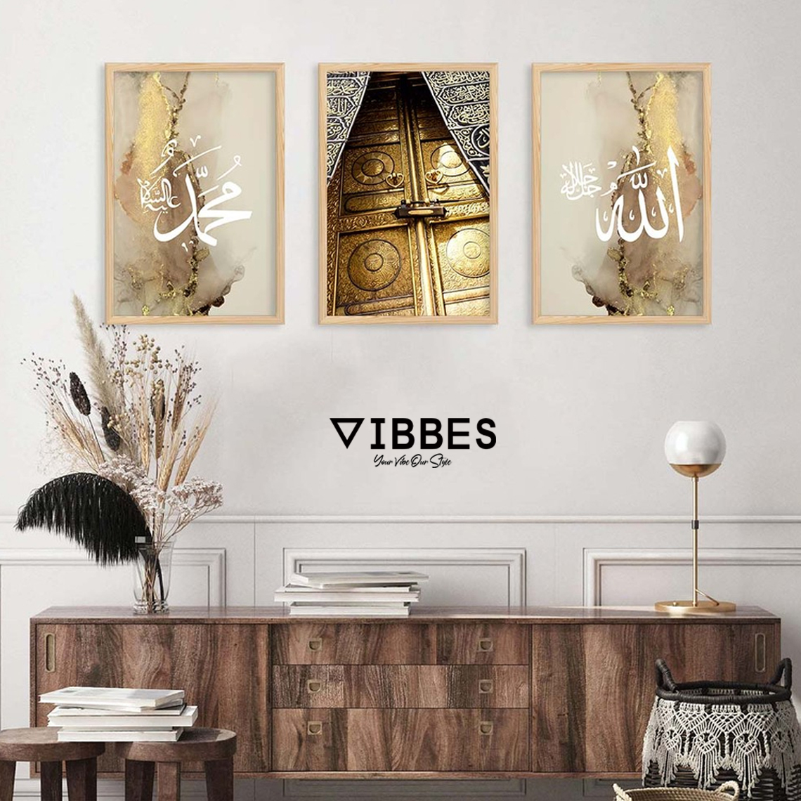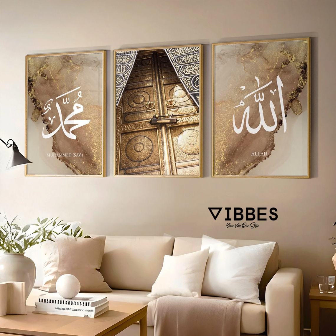 VIBBES Premium Islamic Wall Art Set of 3 – Allah Muhammad Kaaba Gold Marble