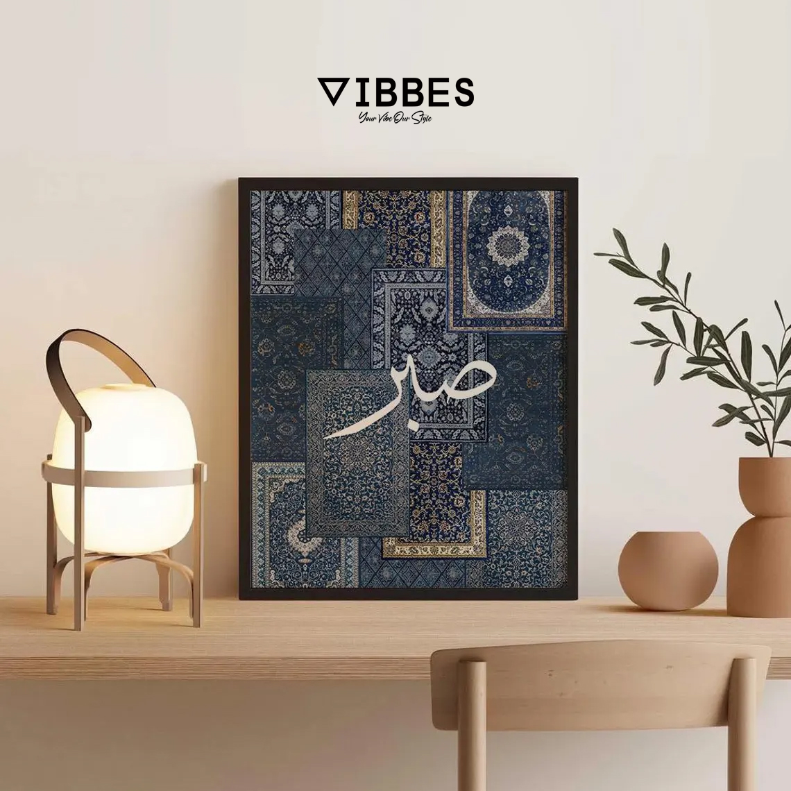 This premium Islamic wall art set of three features the meaningful Arabic words Tawakkul, Shukr and Sabr in a modern blue patchwork carpet-inspired design. The artwork combines traditional Islamic patterns with a contemporary layout, making it ideal for modern homes.