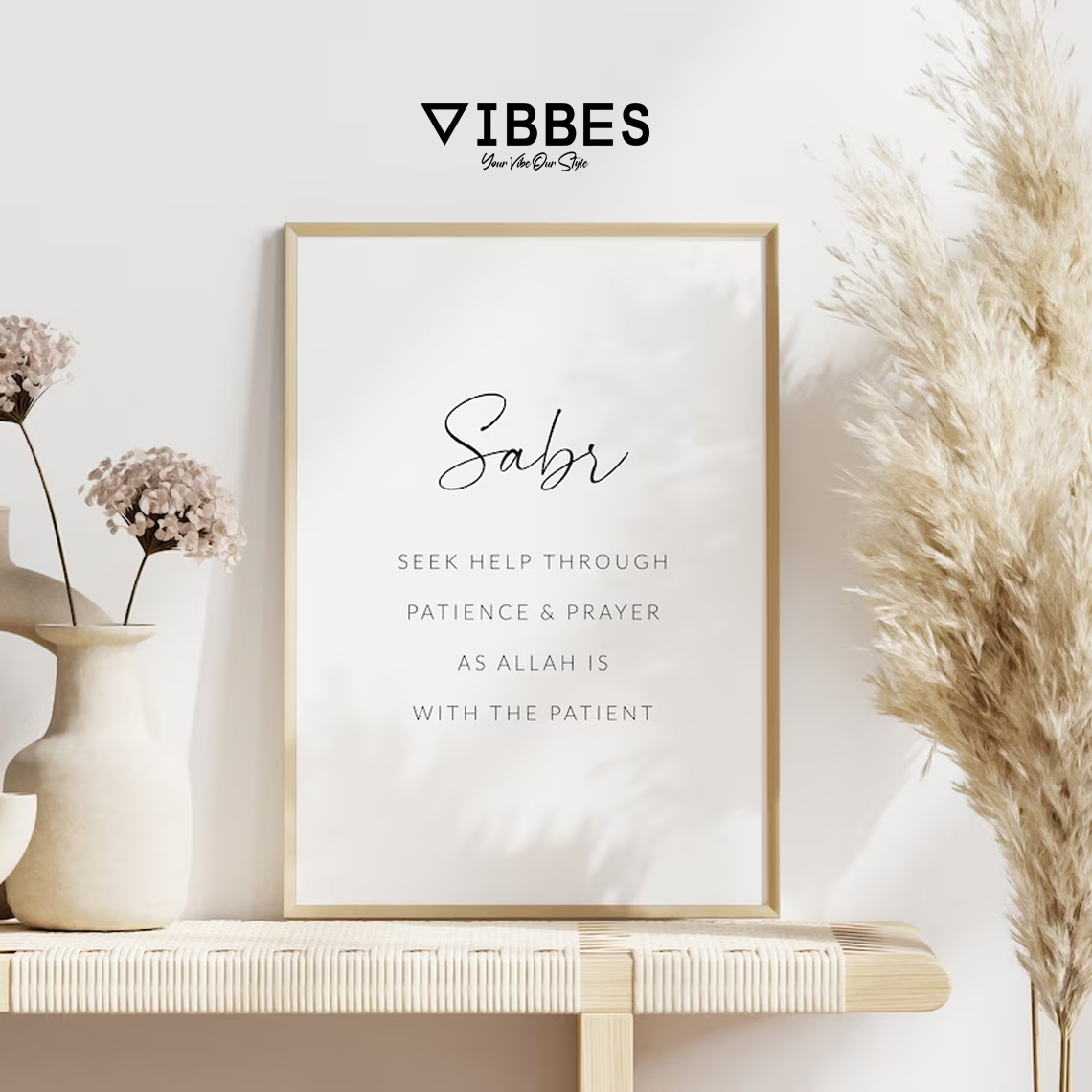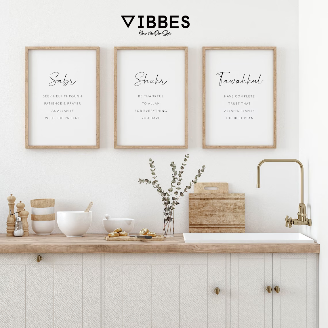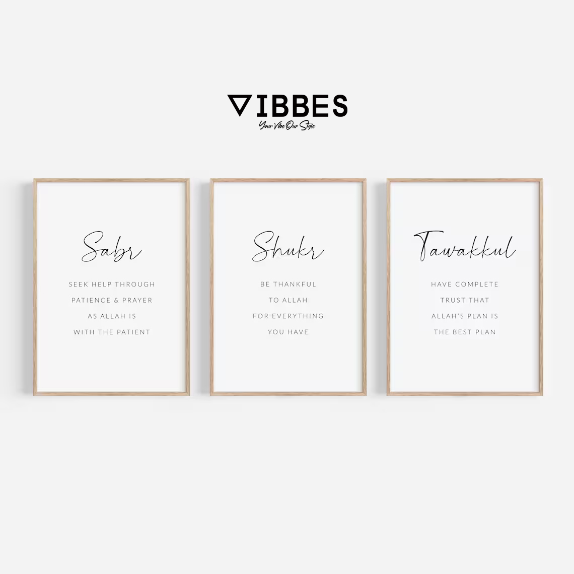 This Islamic quote wall art set is ideal for living rooms, bedrooms, kitchens, prayer rooms, offices and gifting occasions like Ramadan, Eid, housewarming and weddings. Add meaningful and stylish Islamic decor to your home with VIBBES.• Minimal modern Islamic quote wall art