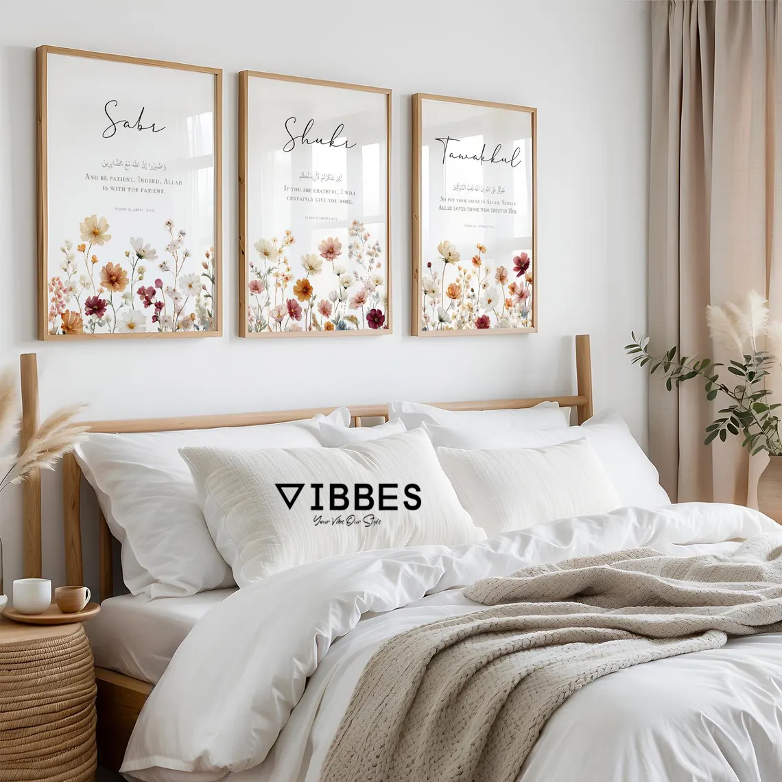 This elegant Islamic wall art set of three features the beautiful words Sabr, Shukr and Tawakkul with soft floral artwork in a minimalist modern style. The design creates a calm, spiritual and aesthetic atmosphere in any room.