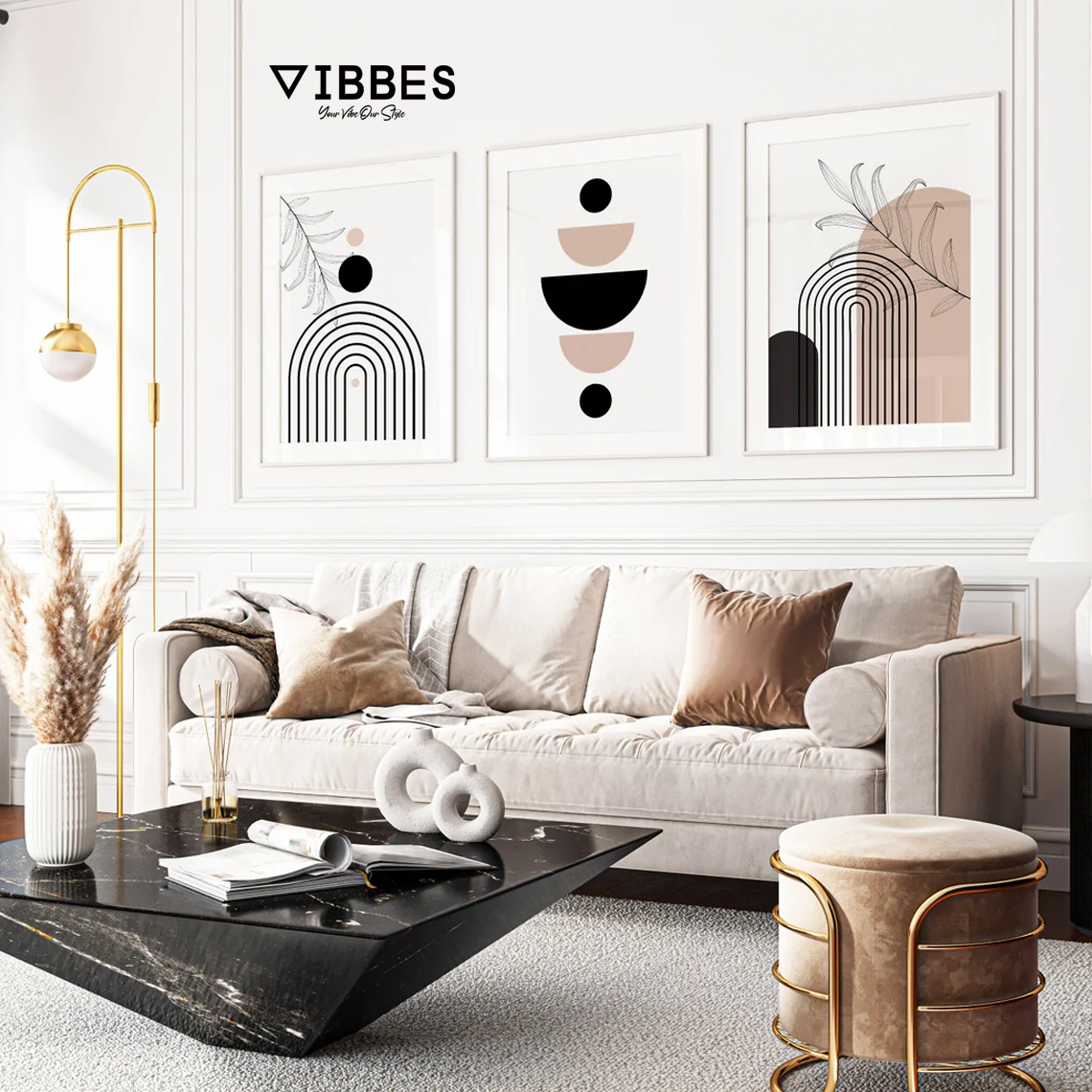 VIBBES Modern Abstract Geometric Botanical Wall Art Set of 3 Minimalist Beige Black Aesthetic Paintings