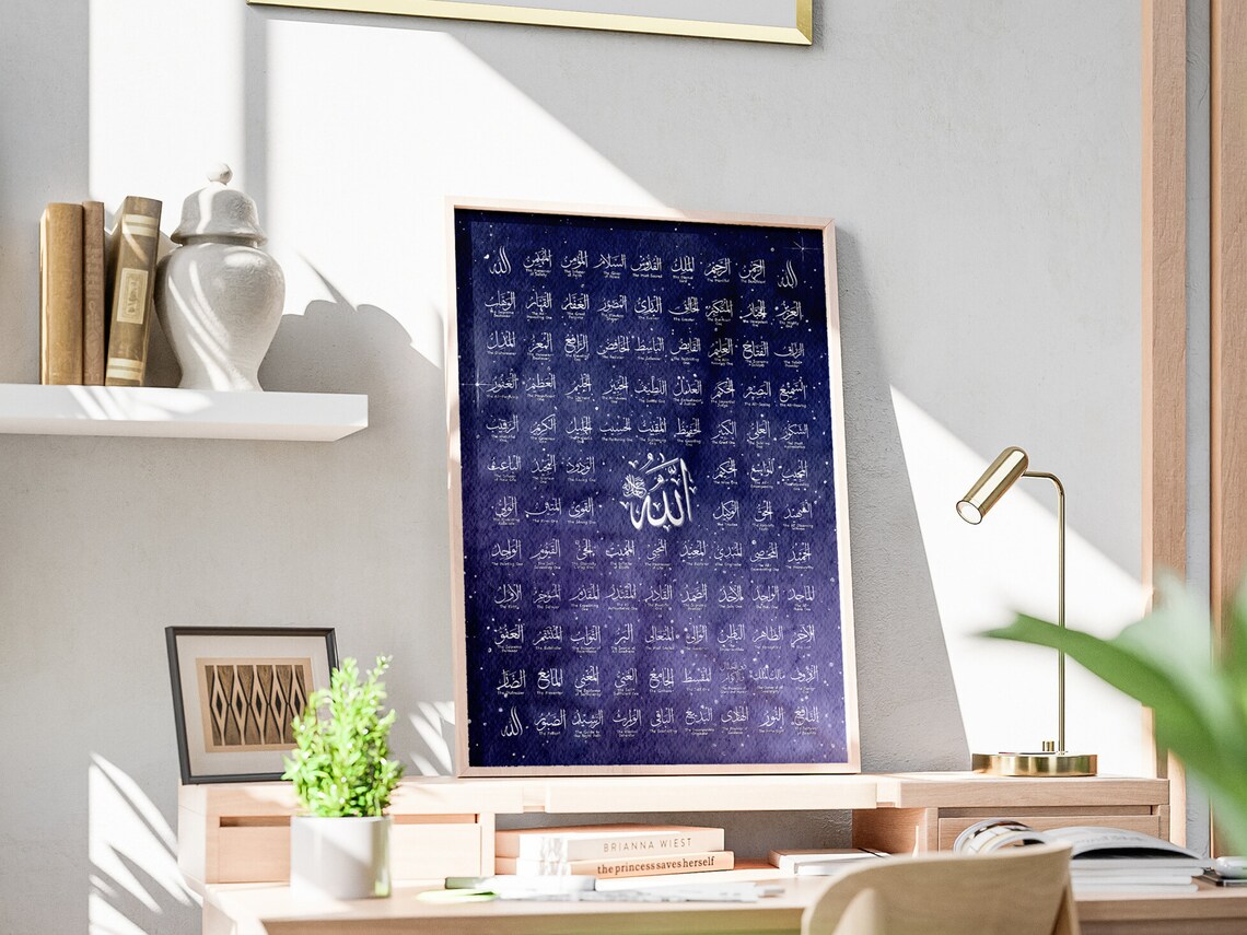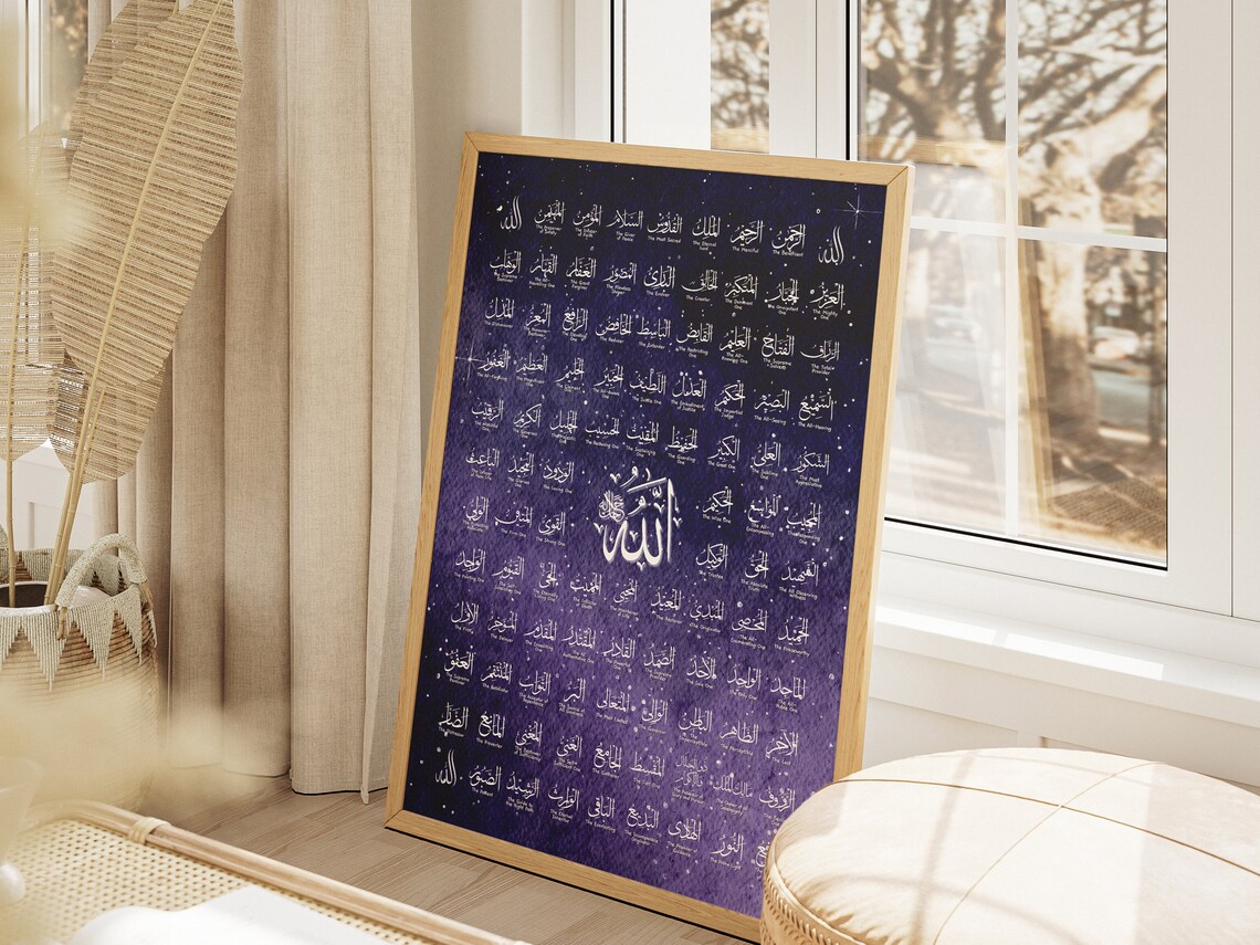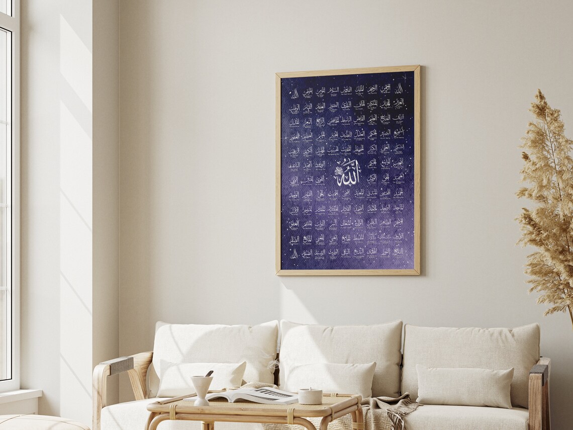 Modern Minimalist Framing To maintain its clean look, this artwork is housed in a minimalist light wood-finish frame. There are no ornate carvings or gold leafing here; instead, the straight lines and natural wood grain enhance the modern feel of the blue-and-white art. This simplicity ensures that the focus remains entirely on the sacred names and the beautiful celestial background.