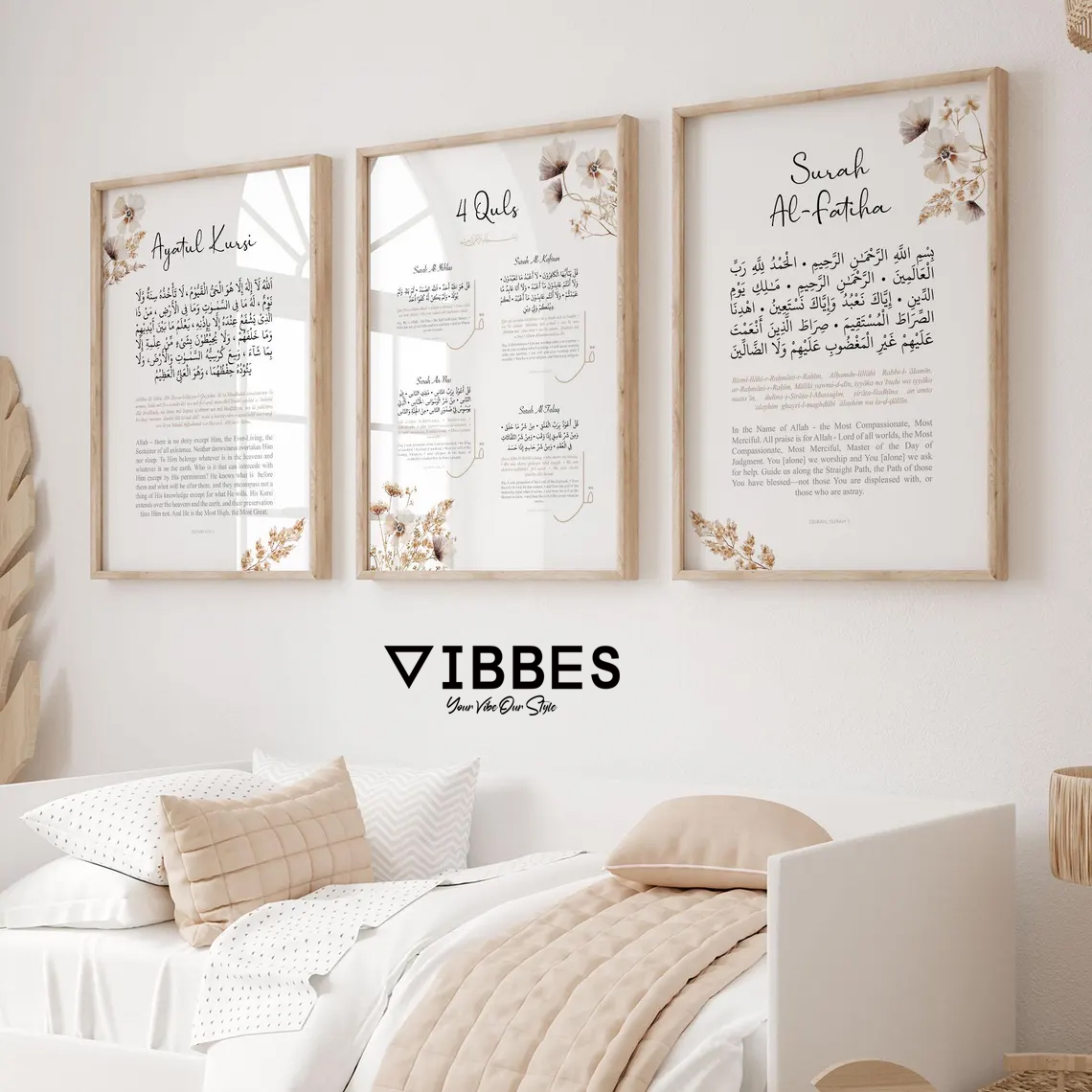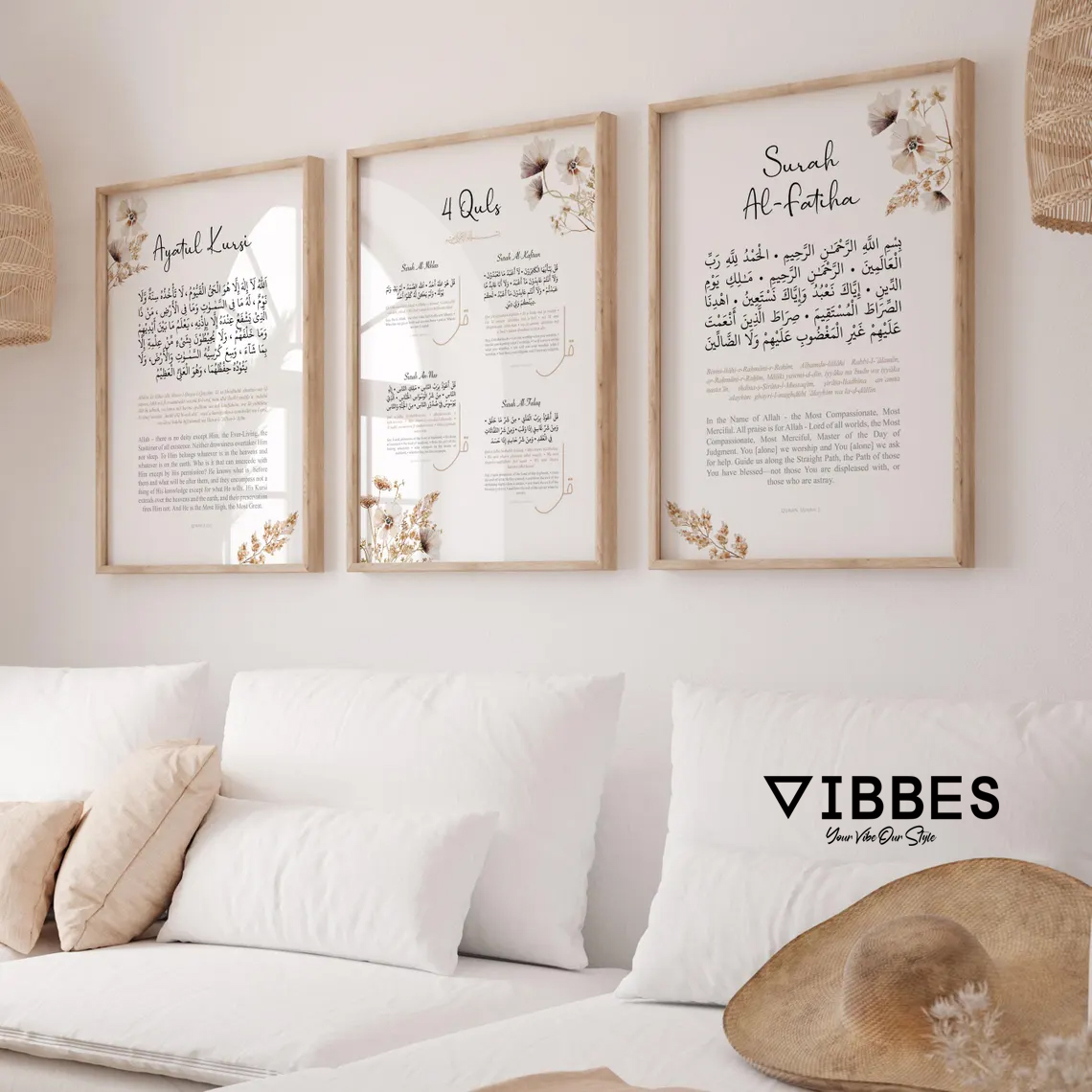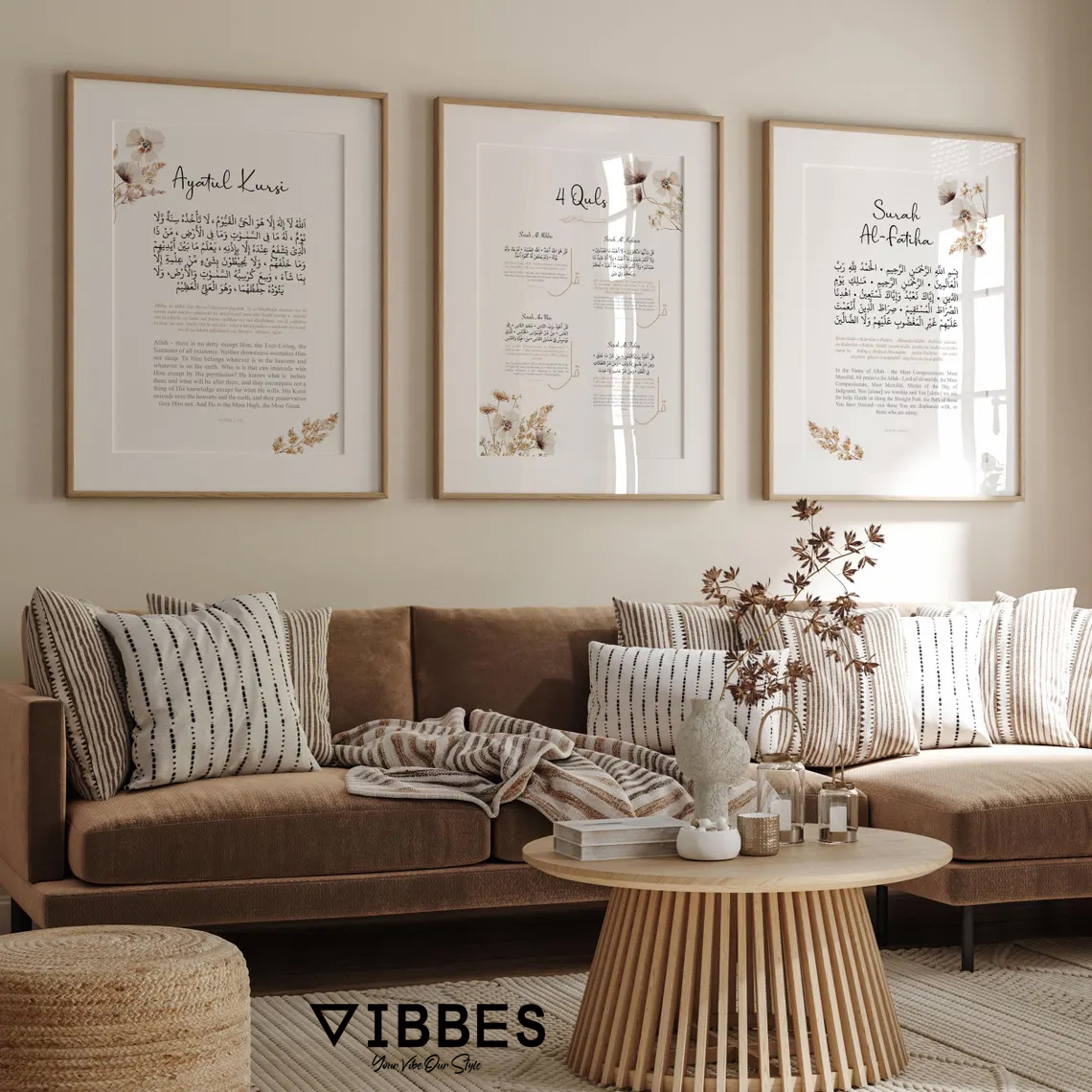 Bring peace and spirituality into your home with the Vibbes Islamic Wall Art Set of 3 featuring Ayatul Kursi, 4 Quls, and Surah Al-Fatiha in an elegant floral minimalist design. This beautiful Quran verse wall art set is perfect for Muslim homes, bedrooms, prayer rooms, living rooms, and offices.