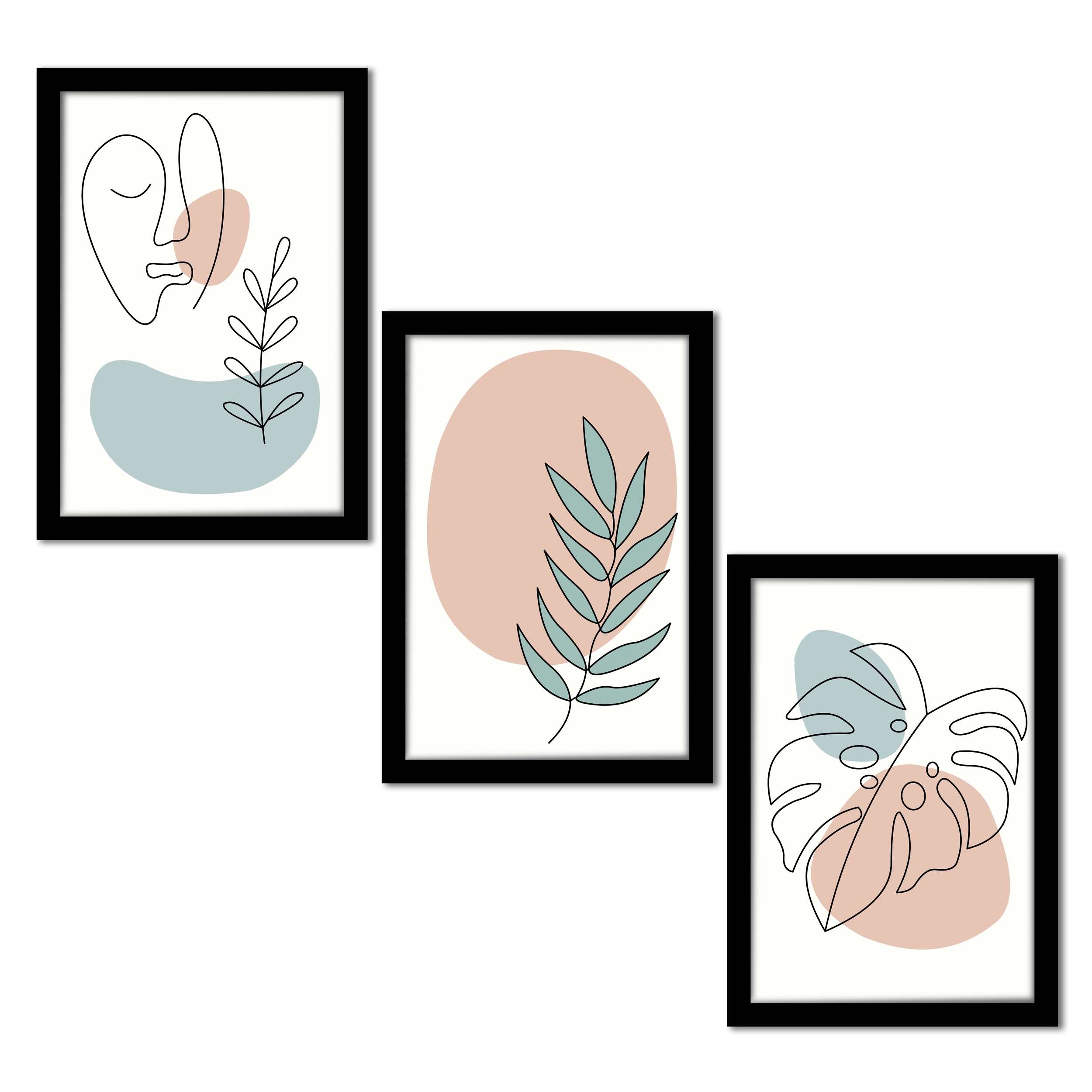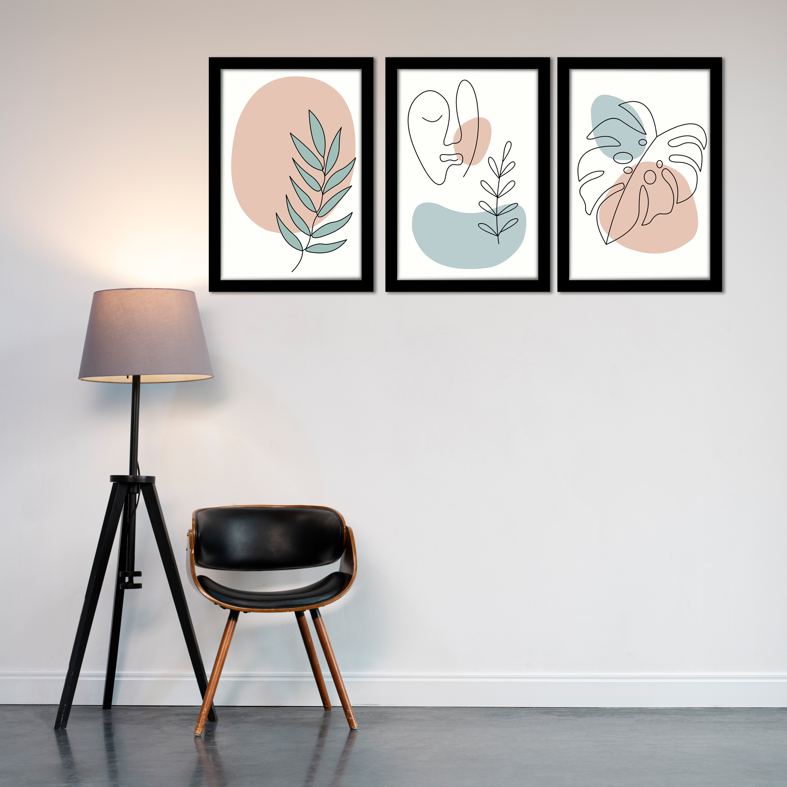 Vibbes Modern Abstract Line Art Wall Art Set of 3 | Minimal Face & Botanical Leaf Design | Black Frame with Fibre Glass