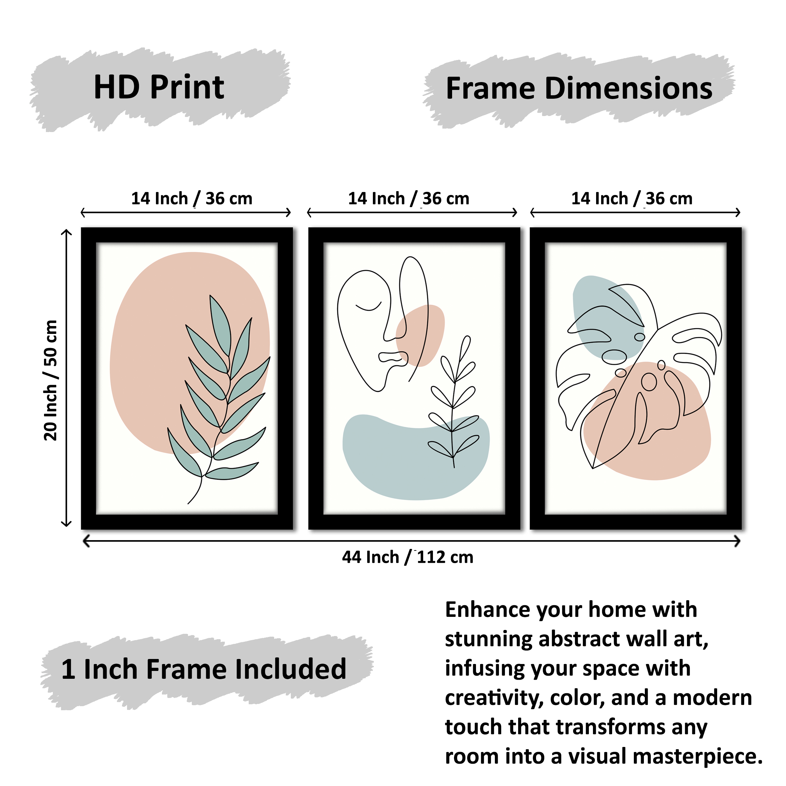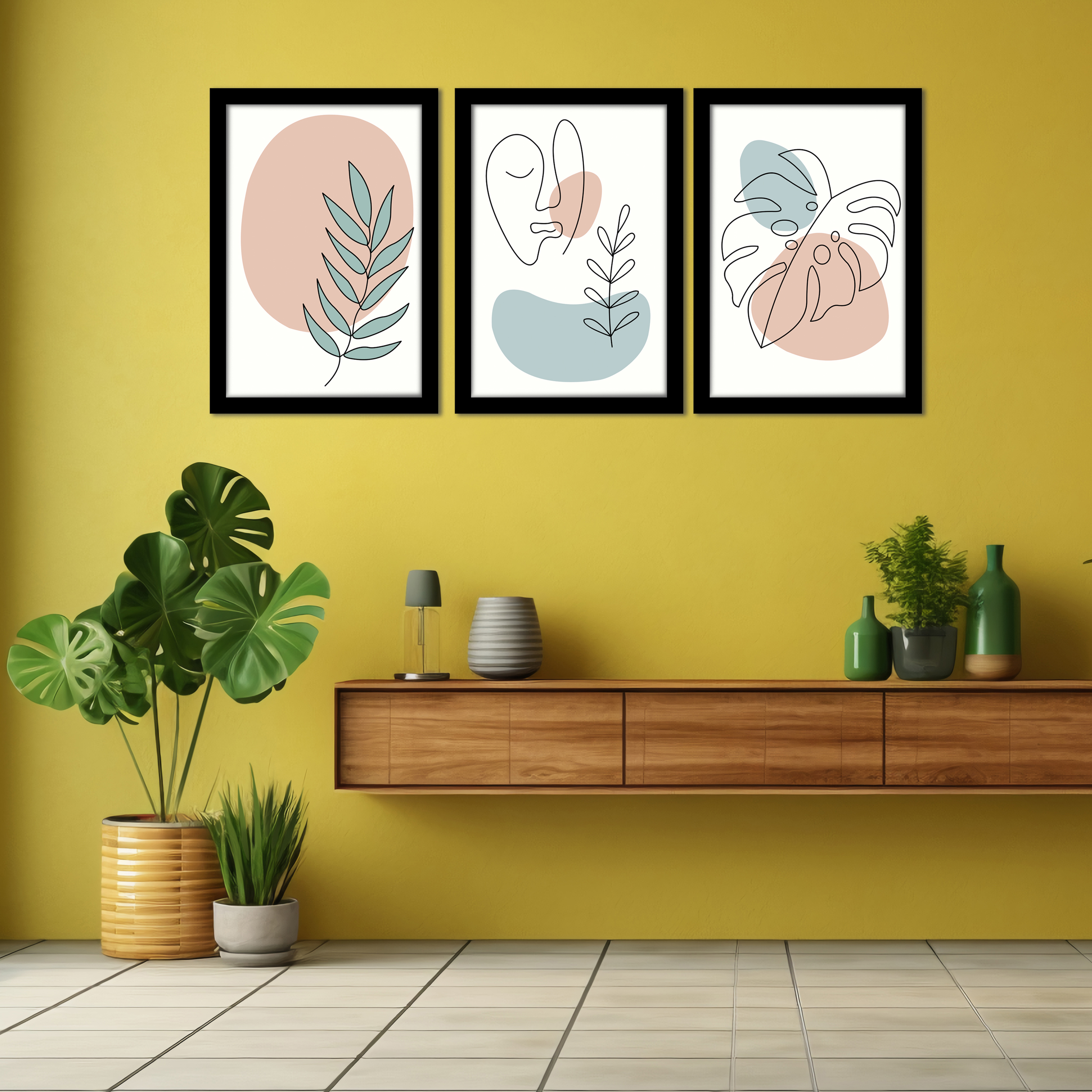 • modern abstract wall art set of 3, minimal line art wall painting, botanical leaf wall art framed, modern face line art wall decor, black frame abstract wall art, fibre glass wall painting, aesthetic wall art for living room, modern home wall decor india, vibbes wall art