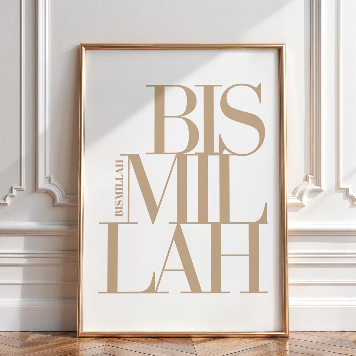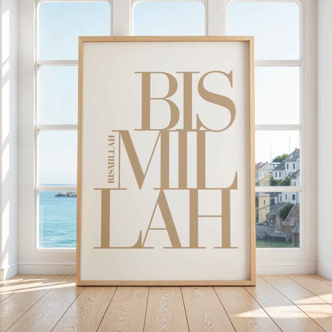 • bismillah wall art, bismillah typography frame, modern islamic wall art, minimalist islamic decor, muslim home decor wall art, bismillah modern art, islamic typography poster, contemporary islamic decor, neutral islamic wall art, luxury islamic wall frame