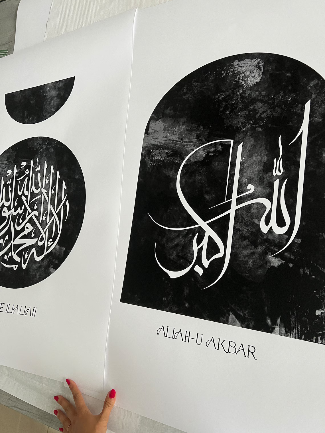 The Shahada (Left): The fundamental declaration of faith, “La ilaha illallah” (There is no god but Allah), beautifully rendered in a contemporary circular script.