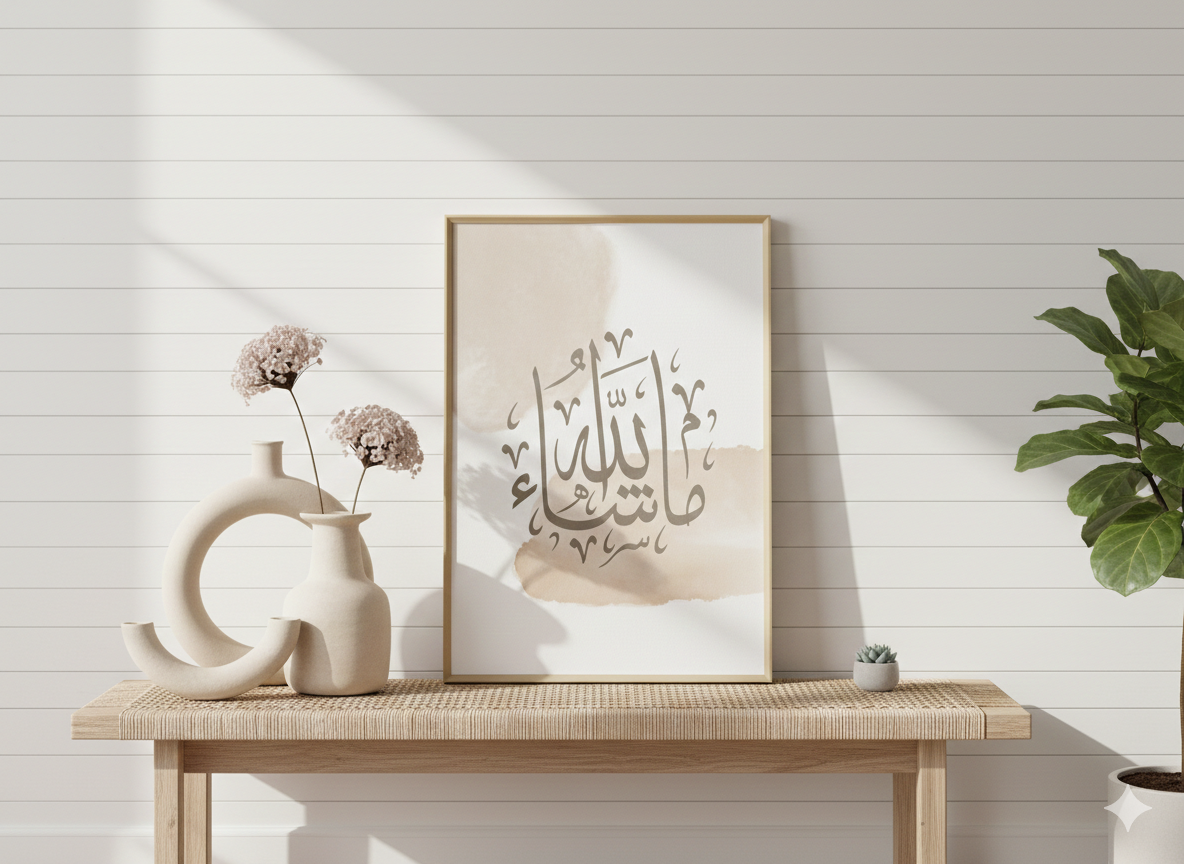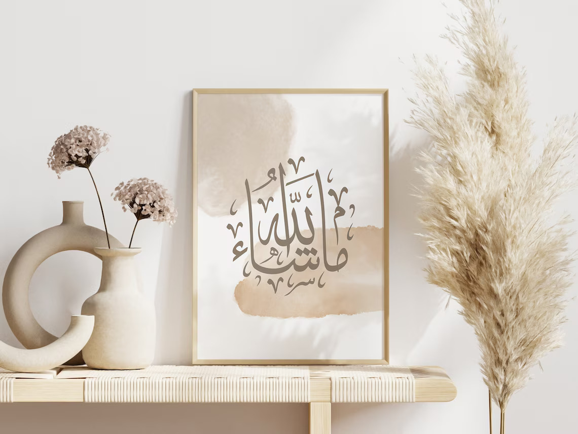 Masha Allah Islamic Calligraphy Wall Frame is a beautiful expression of faith and gratitude, designed to add peace and elegance to your home. Featuring refined Arabic calligraphy with a soft, neutral aesthetic, this artwork blends seamlessly with modern, minimalist, and contemporary interiors.