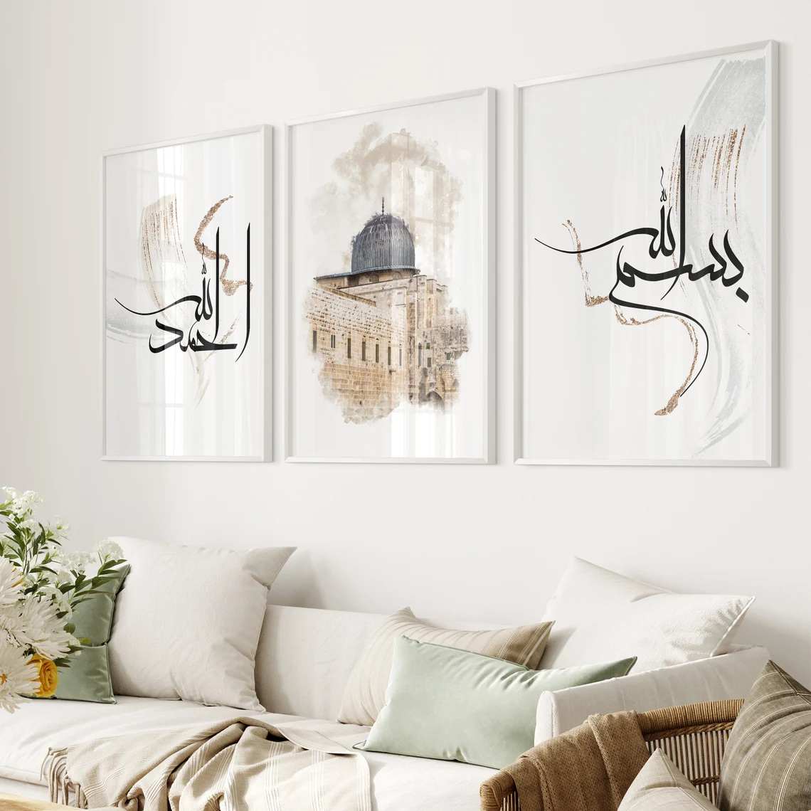 The heart of this triptych is a beautiful watercolor-style rendering of the Al-Aqsa Mosque (Dome of the Rock) in Jerusalem. The soft, ethereal brushstrokes capture the majesty of the golden dome and the ancient stone walls, presented in a neutral palette that evokes a sense of timelessness. This central image serves as a powerful reminder of the deep roots of Islamic history and the significance of this holy sanctuary.