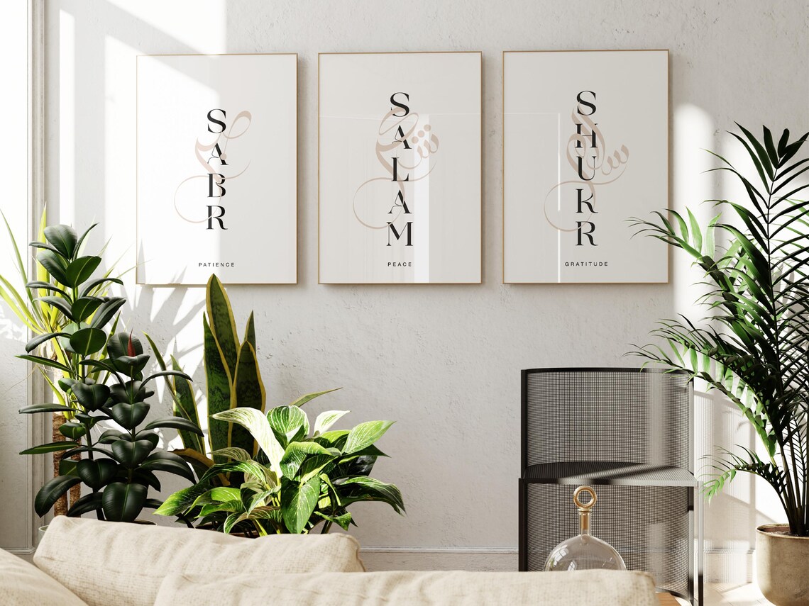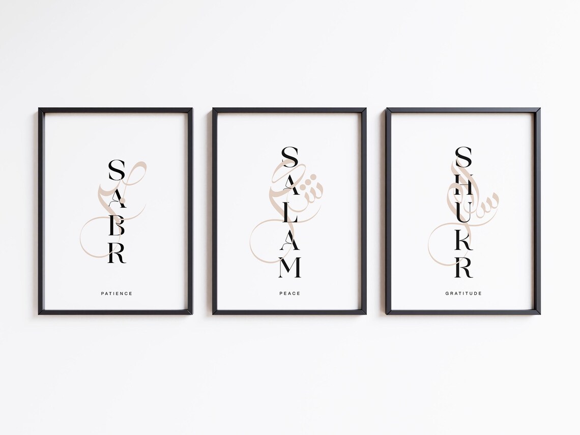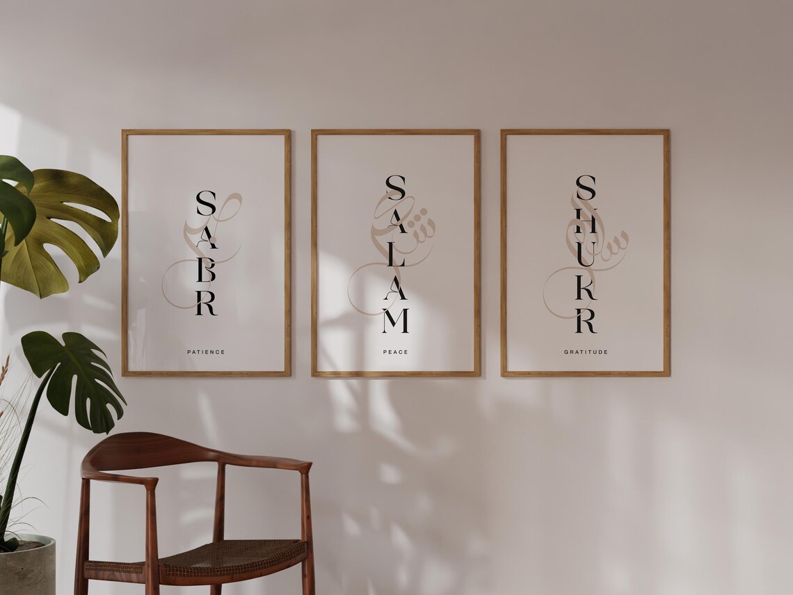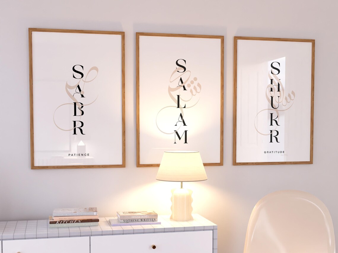 Invite tranquility and mindfulness into your daily life with our Serenity Virtues Collection. This exquisite triptych wall art set features three of the most profound concepts in Islamic tradition: Sabr (Patience), Salam (Peace), and Shukr (Gratitude). Designed for the modern home, this collection serves as a powerful visual reminder to ground oneself in faith and character while maintaining a sophisticated, contemporary aesthetic.