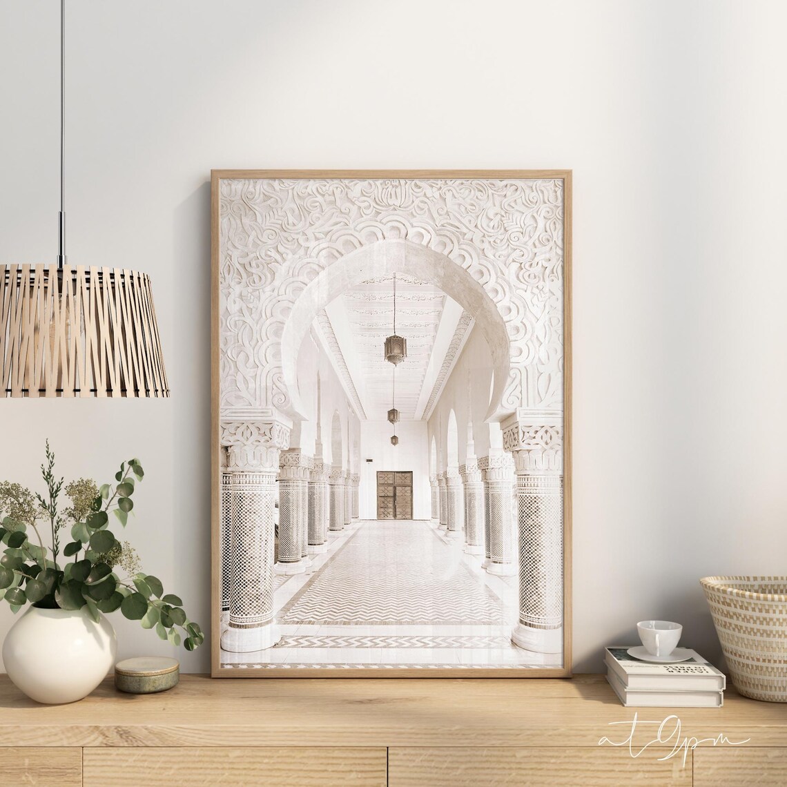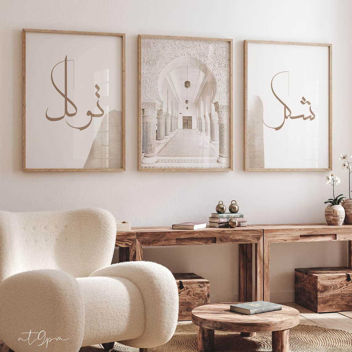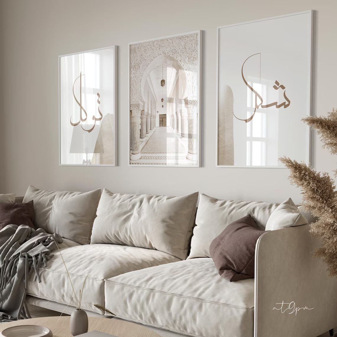 The centerpiece of this set is a high-resolution architectural photograph of a traditional Moroccan-style door. Its intricate arches and weathered textures represent the history and strength of Islamic heritage. Flanking this "Gateway" are two minimalist typography prints. The calligraphy is rendered in a modern, flowing script that mirrors the curves of the central arch, creating a perfect visual symmetry. This "Boho-Islamic" aesthetic uses a soft, earthy color palette of tan, sand, and charcoal, making it an ideal fit for contemporary, neutral-toned, or Japandi-style interiors.