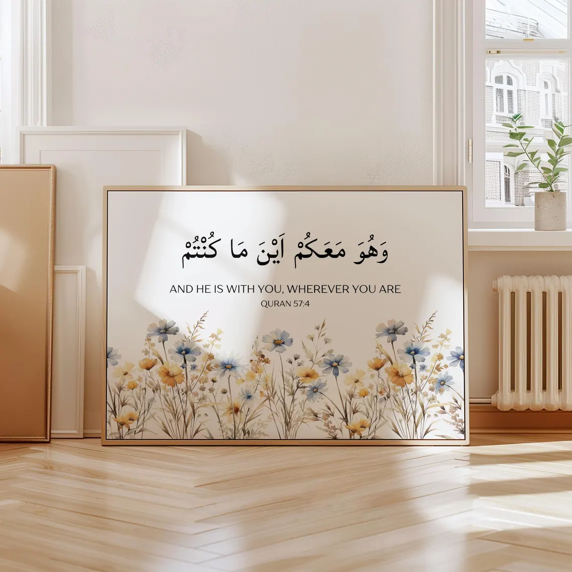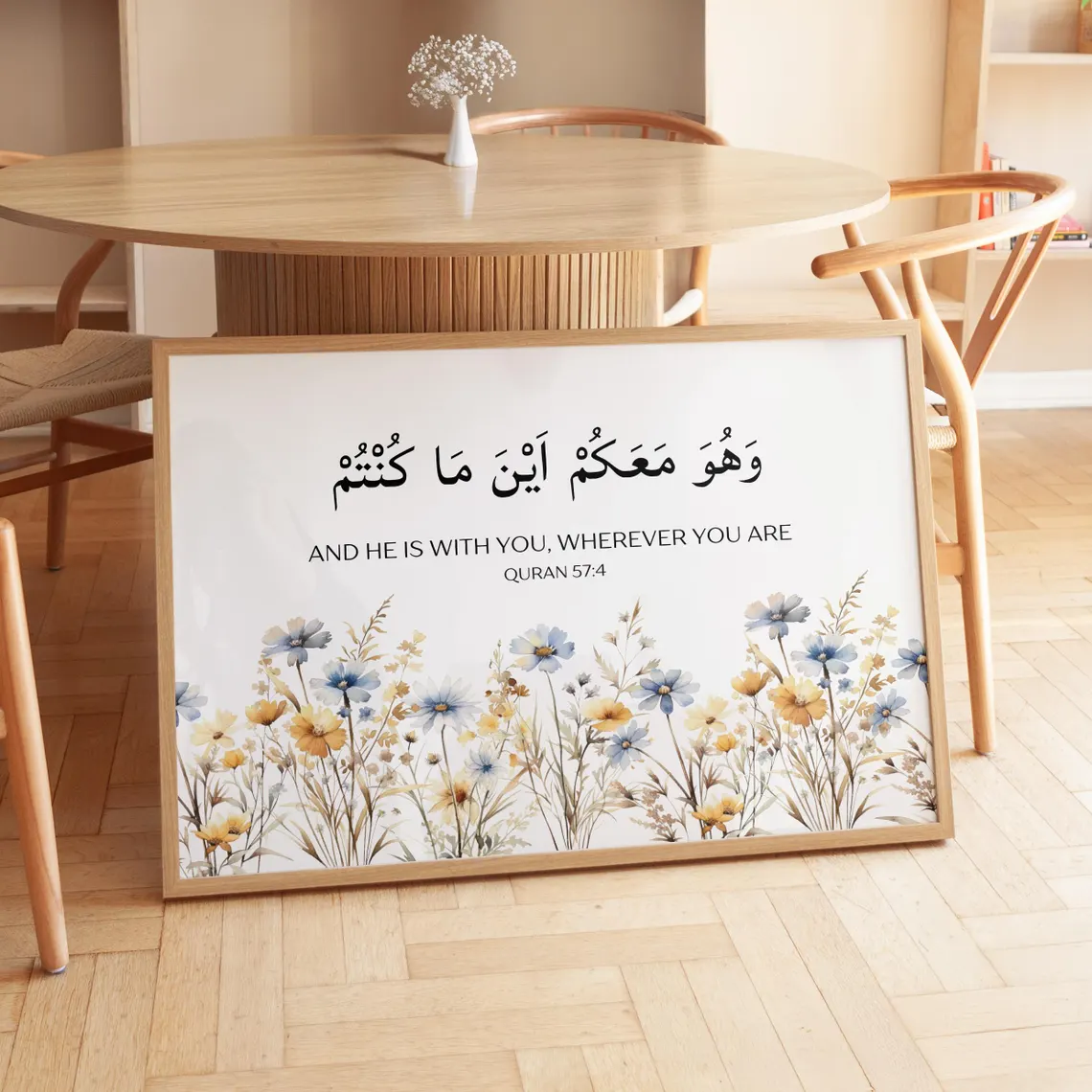 Bring a profound sense of comfort and security into your living space with our Divine Presence Frame. This stunning horizontal piece features one of the most reassuring verses in the Holy Quran: "And He is with you wherever you are" (Surah Al-Hadid, 57:4). Designed as a modern spiritual anchor, this frame serves as a constant reminder that you are never truly alone, grounding your heart in the omnipresence and mercy of the Creator.