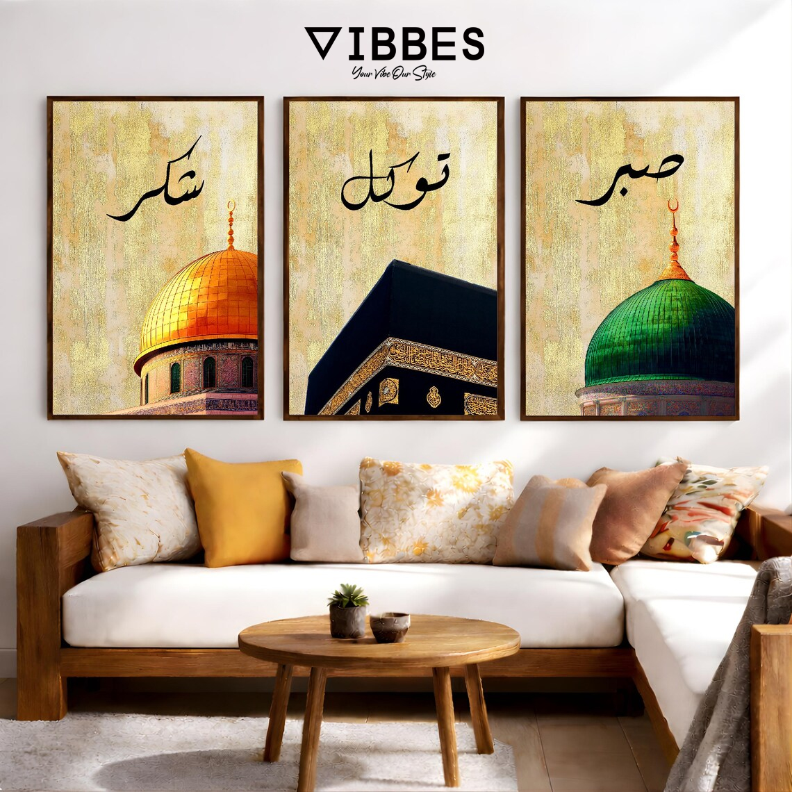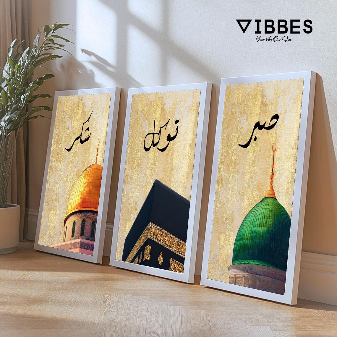 Bring faith, patience, gratitude, and complete trust in Allah into your living space with our Sabr Shukr Tawakkul Islamic Wall Art Set, a beautifully curated collection that blends powerful Islamic values with iconic holy places. This elegant three-piece wall art set features the Arabic calligraphy of Sabr (Patience), Shukr (Gratitude), and Tawakkul (Trust in Allah), paired with visually stunning representations of sacred Islamic landmarks.