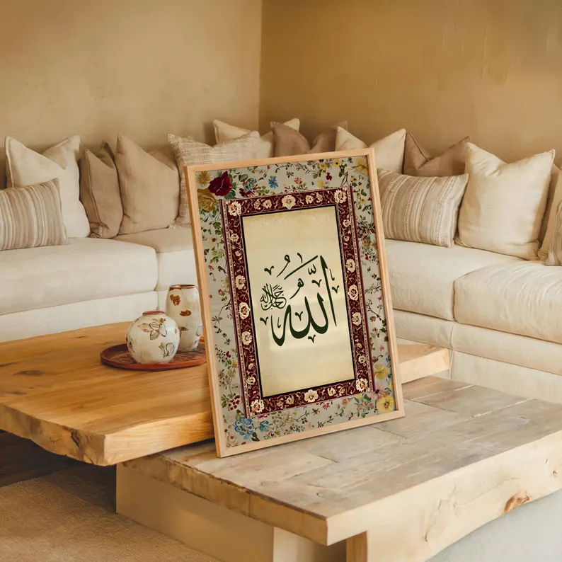 The Foundation of Dhikr The names of Allah and His Messenger, Muhammad (PBUH), are the spiritual anchors of a Muslim home. Our design presents these names in high-contrast, bold Arabic script. To aid in daily reflection, each frame includes a modern English translation at the bottom—"Allah is sufficient for me" and "Muhammad is the Messenger of Allah"—ensuring the message is accessible to all family members and guests.