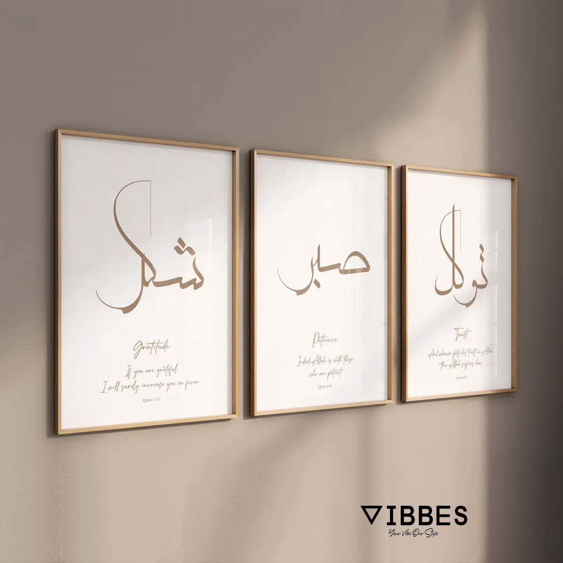 This modern Islamic Calligraphy Wall Art Set of 3 is designed to bring elegance, spirituality, and serenity into your home. The artwork features contemporary Arabic calligraphy with meaningful Islamic concepts: Gratitude, Patience, and Trust. These values represent core Islamic teachings and inspire mindfulness, faith, and positivity in daily life.