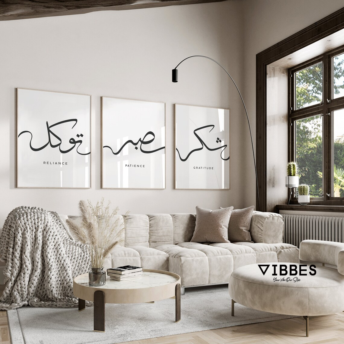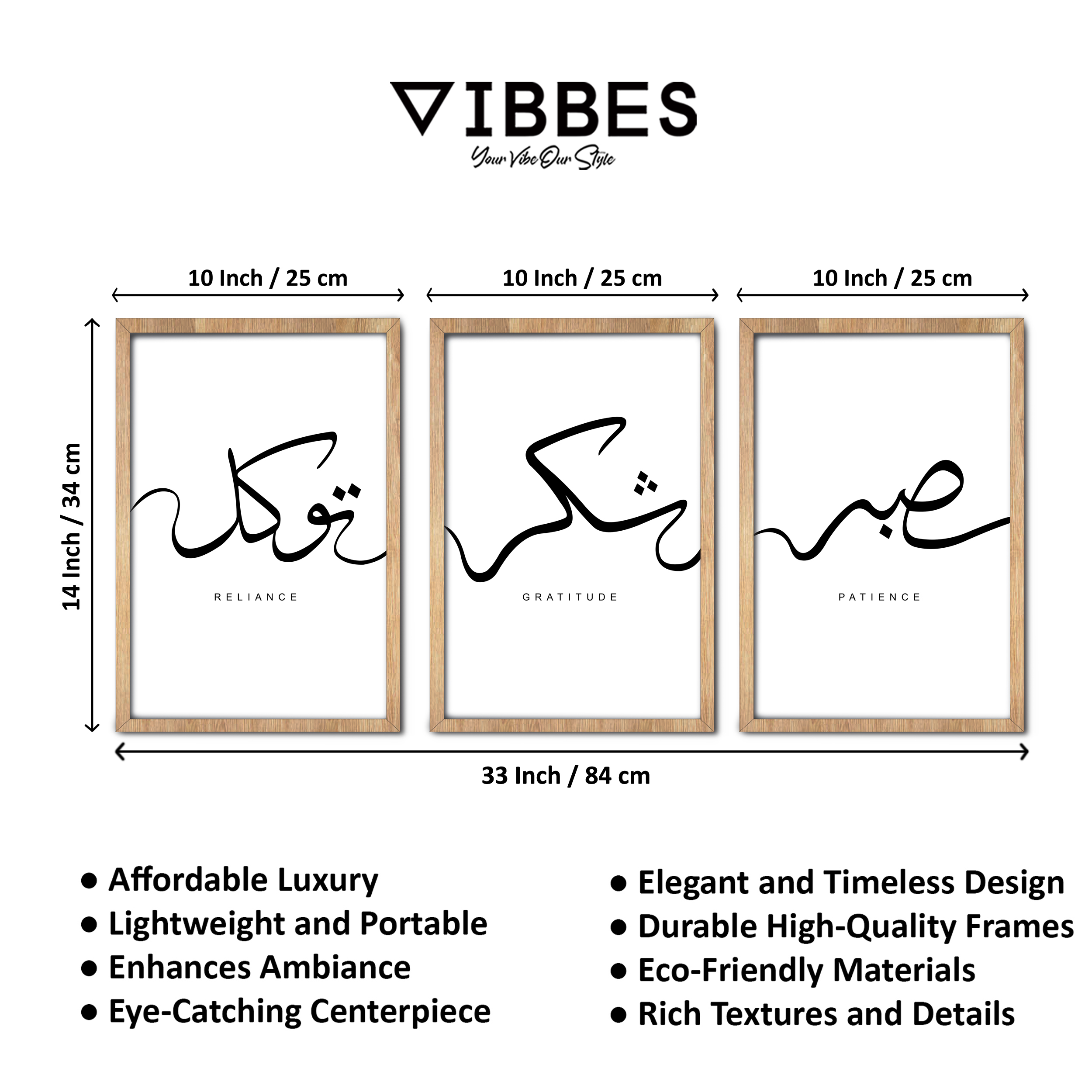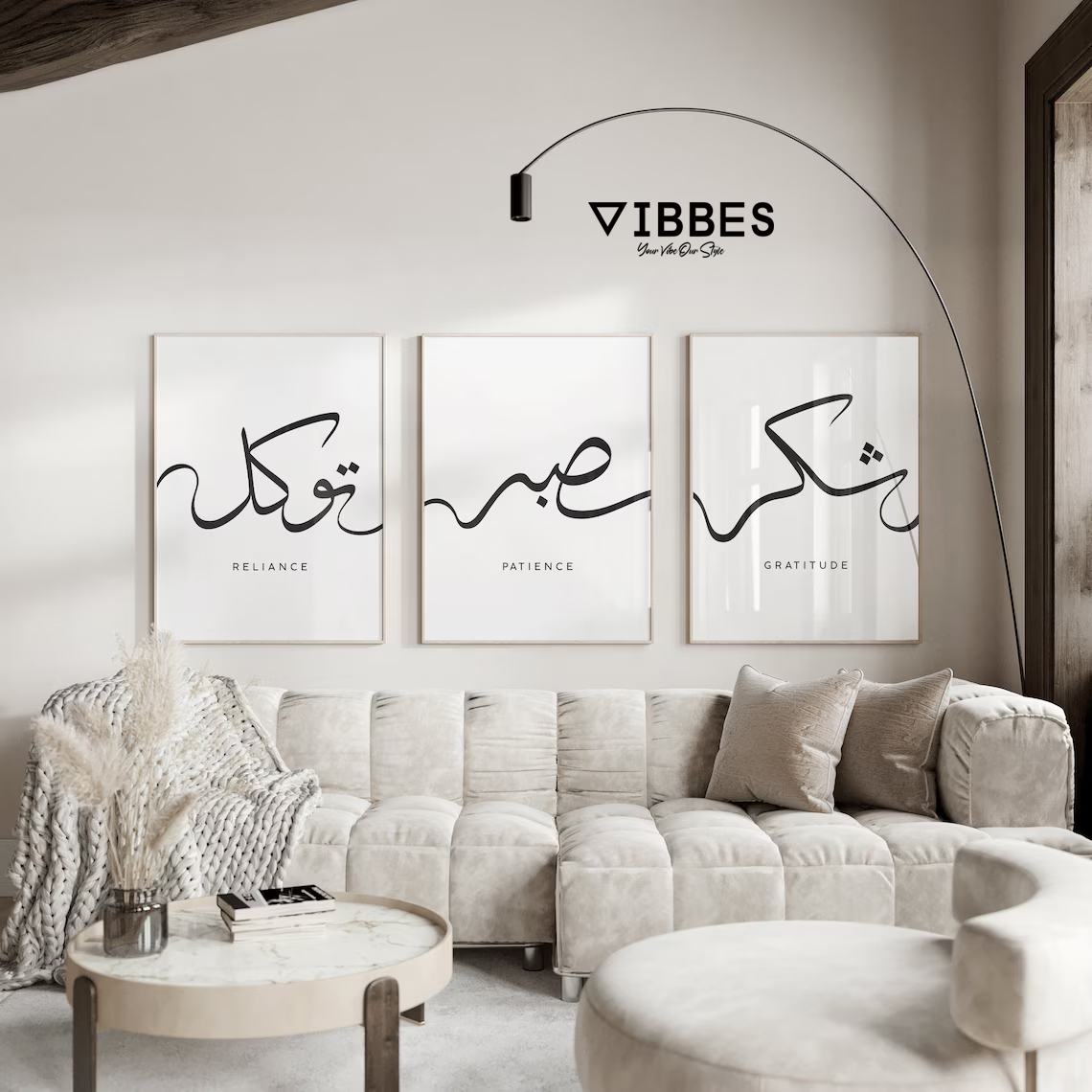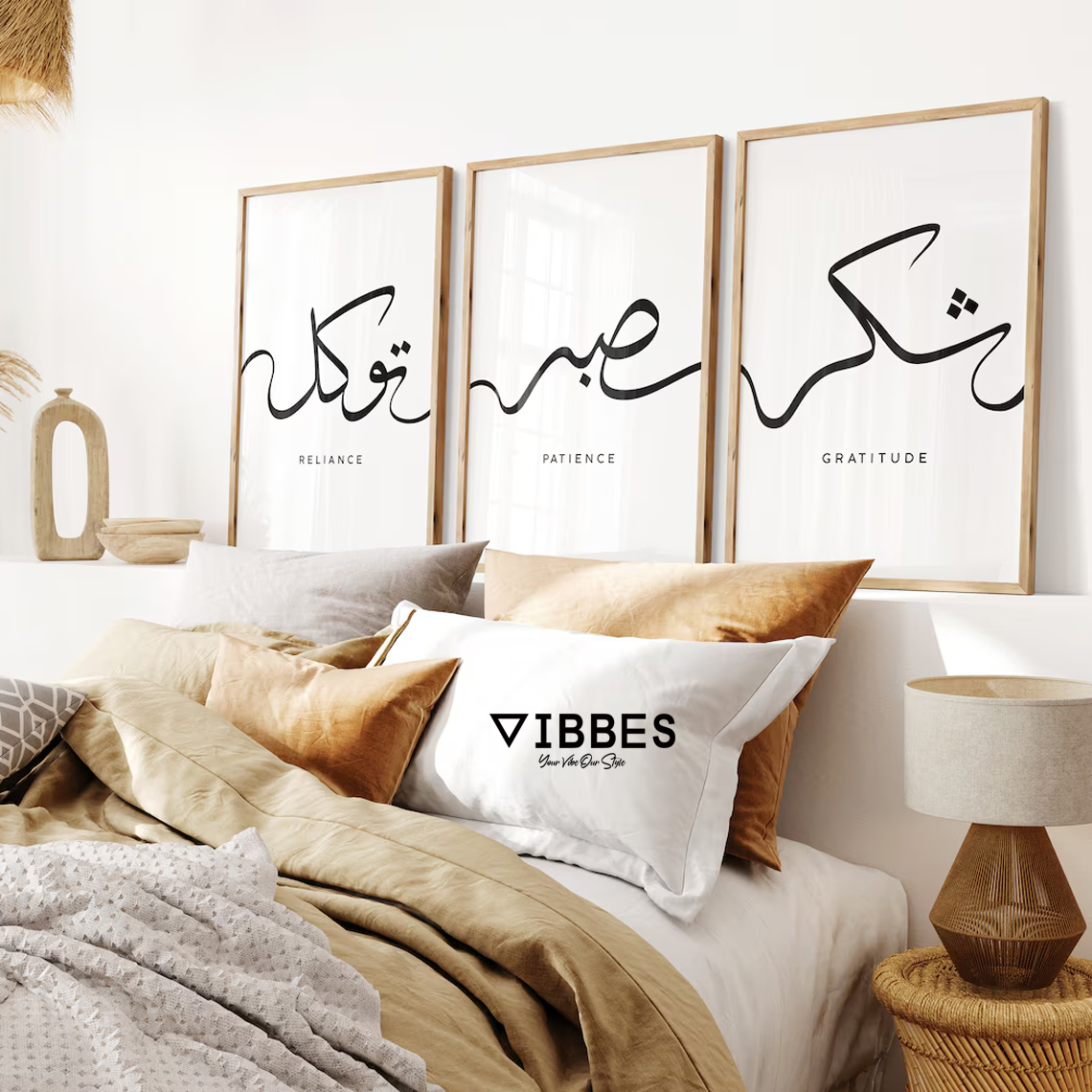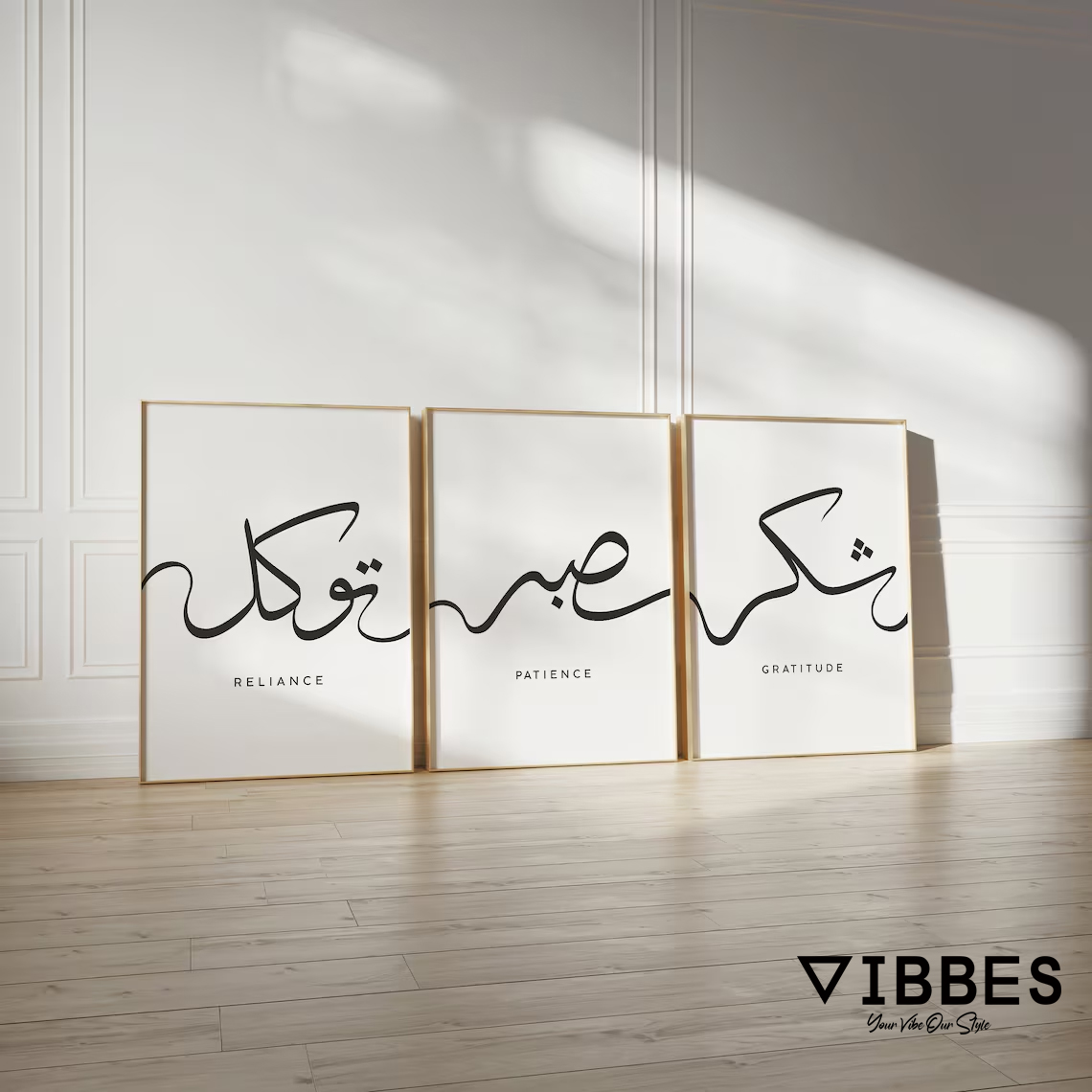 This modern Islamic Calligraphy Wall Art Set of 3 is a minimalist and elegant decor piece designed to bring spirituality and calmness into your living space. The artwork features contemporary Arabic calligraphy with meaningful Islamic values: Reliance, Patience, and Gratitude. These words reflect trust in Allah, perseverance in life, and thankfulness for blessings, making this set deeply spiritual and inspirational.