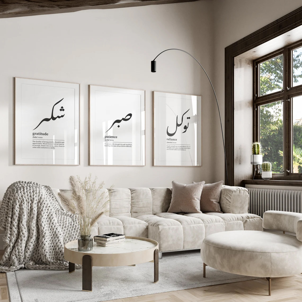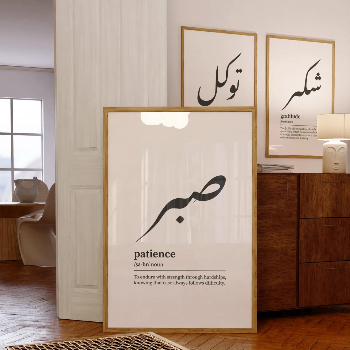 • modern Islamic wall art, Arabic calligraphy wall decor, reliance patience gratitude wall art, Islamic bedroom decor, Muslim home wall art, dictionary style wall art, minimalist Islamic decor, framed Islamic prints, Scandinavian wall decor, contemporary Islamic wall art, Islamic quotes wall decor